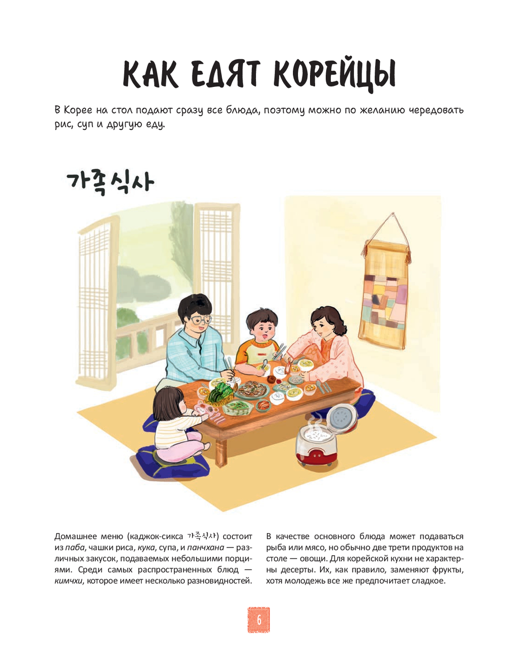Каковы правила поведения за столом? Почему корейцы так любят ферментированные продукты? Как украсить пибимпаб? В чем секрет жареной курицы по-корейски? Что подают к столу на семейных праздниках? Какие блюда приносят удачу? Чем может порадовать уличная еда? Какие десерты самые вкусные?