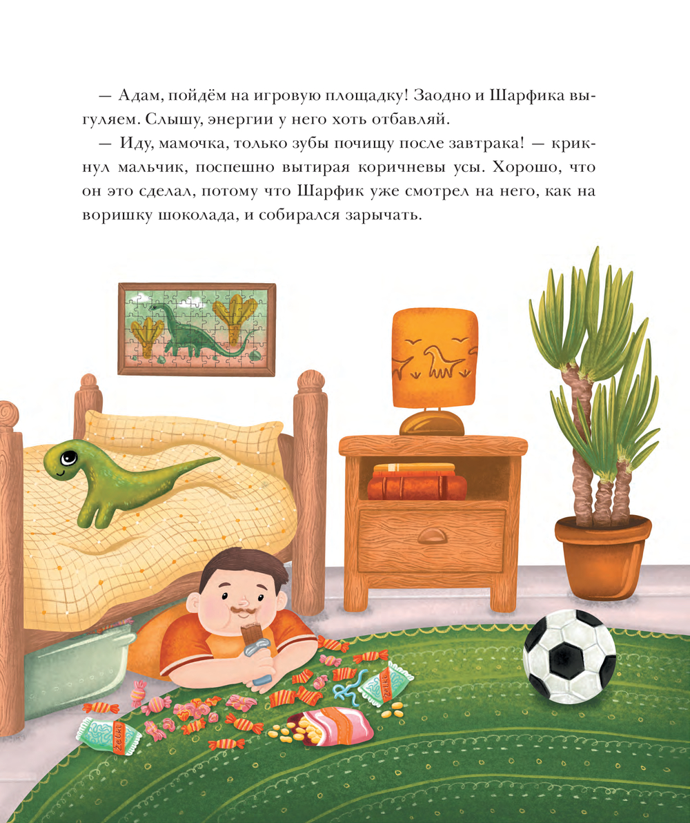 Адам – весёлый и активный мальчик. Он любит динозавров, своего пса Шарфика и футбол. Но однажды Адам замечает, что у него совсем нет сил. Обеспокоенная мама едет с ним к доктору, который ставит диагноз: анемия. Это всё потому, что Адам ел слишком много сладостей. Что сделать, чтобы кровь вновь стала сильной? Есть один способ: диета, богатая железом.
