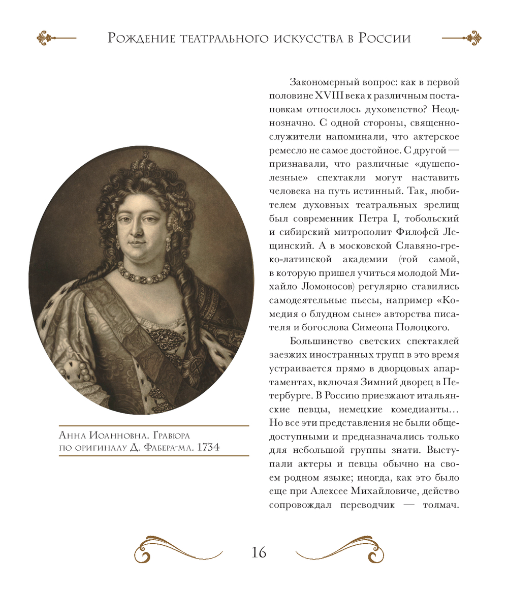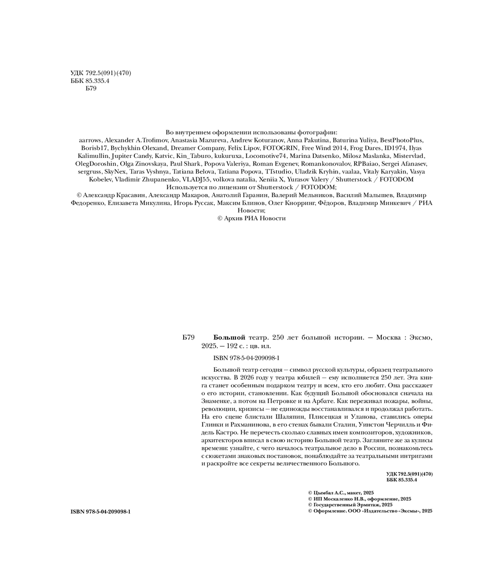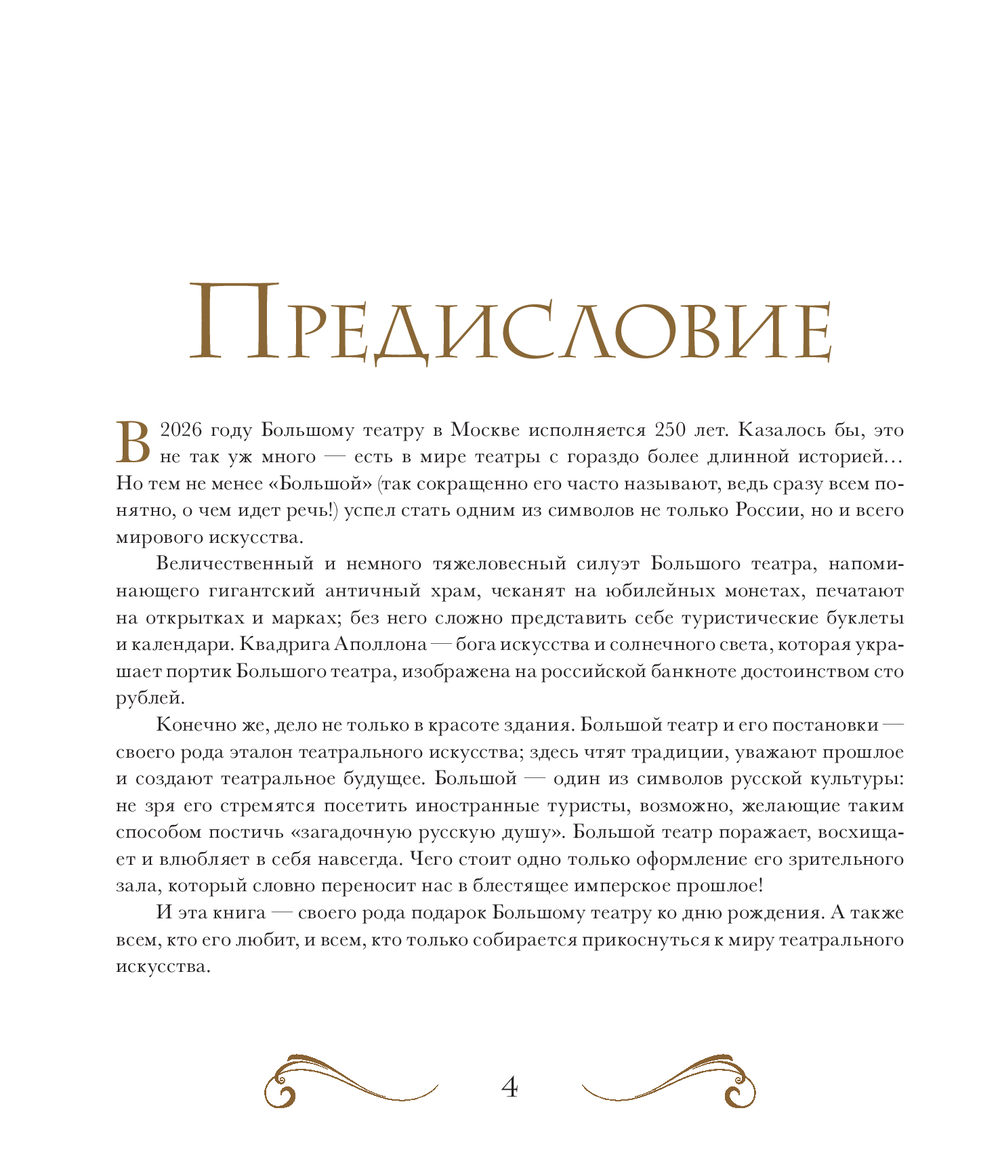 Большой театр сегодня – символ русской культуры, образец театрального искусства. В 2026 году у театра юбилей – ему исполняется 250 лет. Эта книга станет особенным подарком театру и всем, кто его любит. Она расскажет о его истории, становлении. Как будущий "Большой" обосновался сначала на Знаменке, а потом на Петровке и на Арбате. Как переживал пожары, войны, революции, кризисы – не единожды восстанавливался и продолжал работать. На его сцене блистали Шаляпин, Плисецкая и Уланова, ставились оперы Глинки и Рахманинова, в его стенах бывали Сталин, Уинстон Черчилль и Фидель Кастро. Не перечесть сколько славных имен композиторов, художников, архитекторов вписал в свою историю Большой театр. Загляните же за кулисы времени: узнайте, с чего началось театральное дело в России, познакомьтесь с сюжетами знаковых постановок, понаблюдайте за театральными интригами и раскройте все секреты величественного "Большого".
