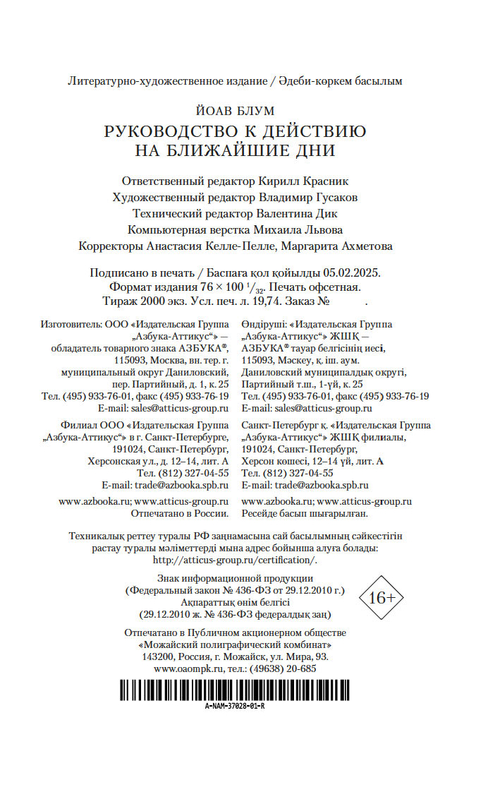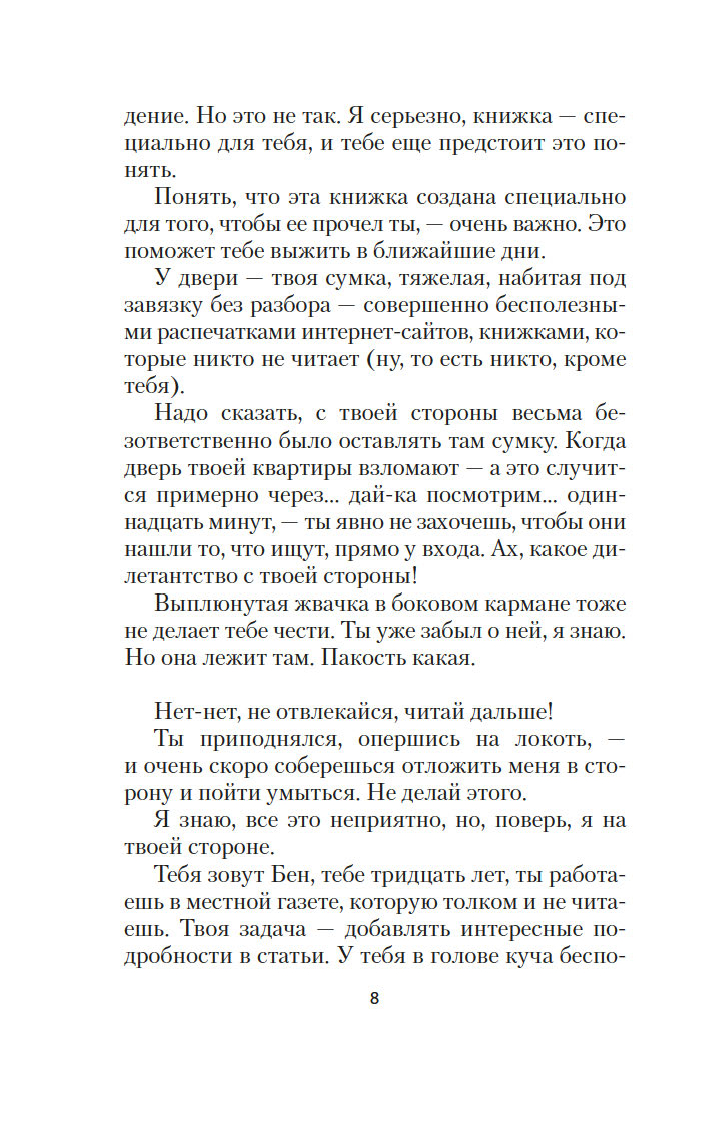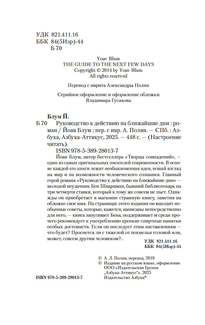 Йоав Блум, автор бестселлера "Творцы совпадений", – один из самых оригинальных писателей современности. В основе каждой его книги лежит необыкновенная идея, новый взгляд на мир и на возможности человеческого сознания. Главный герой романа "Руководство к действию на ближайшие дни" – молодой неудачник Бен Шварцман, бывший библиотекарь на три четверти ставки, который к тому же совсем не пьет. Однажды он приобретает в магазине странную книгу, заметив на обложке свое имя. На страницах этого издания он находит необычные советы, которые, кажется, написаны непосредственно для него, – книга запугивает Бена, поддерживает и среди прочего рекомендует к употреблению крепкие спиртные напитки особых достоинств. Если он последует этим наставлениям – что будет? Проснется ли с тяжелой от похмелья головой или, может, совсем другим человеком?..