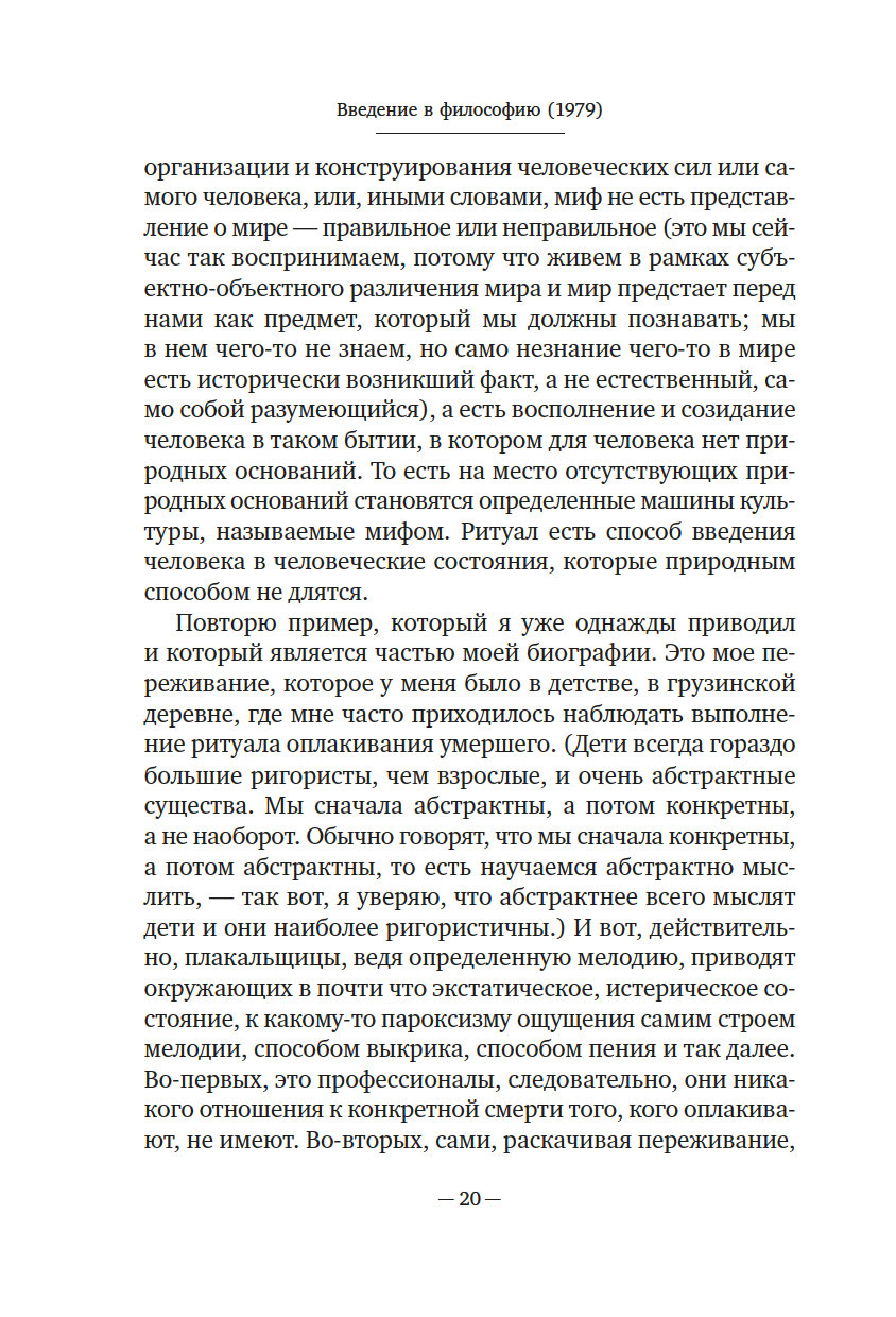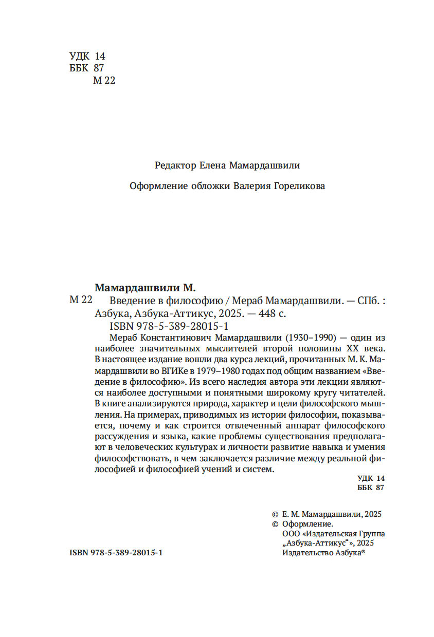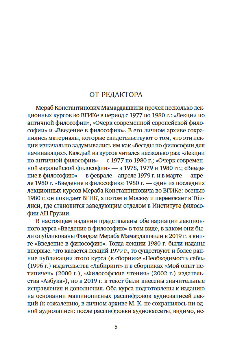 Мераб Константинович Мамардашвили (1930-1990) – один из наиболее значительных мыслителей второй половины ХХ века. В настоящее издание вошли два курса лекций, прочитанных М. К. Мамардашвили во ВГИКе в 1979-1980 годах под общим названием "Введение в философию". Из всего наследия автора эти лекции являются наиболее доступными и понятными широкому кругу читателей. В книге анализируются природа, характер и цели философского мышления. На примерах, приводимых из истории философии, показывается, почему и как строится отвлеченный аппарат философского рассуждения и языка, какие проблемы существования предполагают в человеческих культурах и личности развитие навыка и умения философствовать, в чем заключается различие между реальной философией и философией учений и систем.