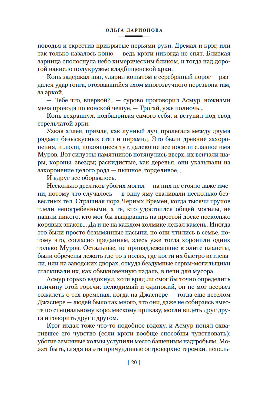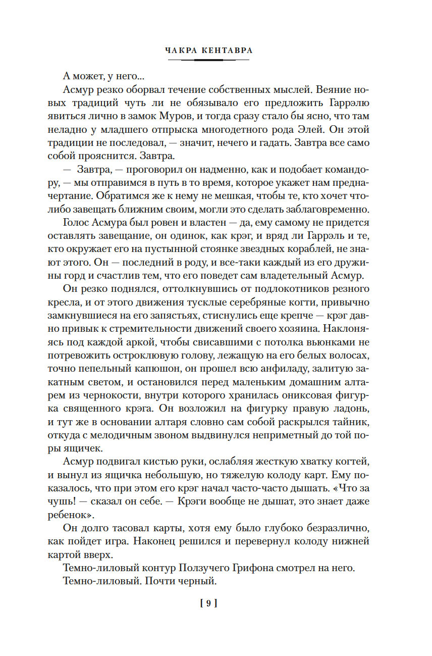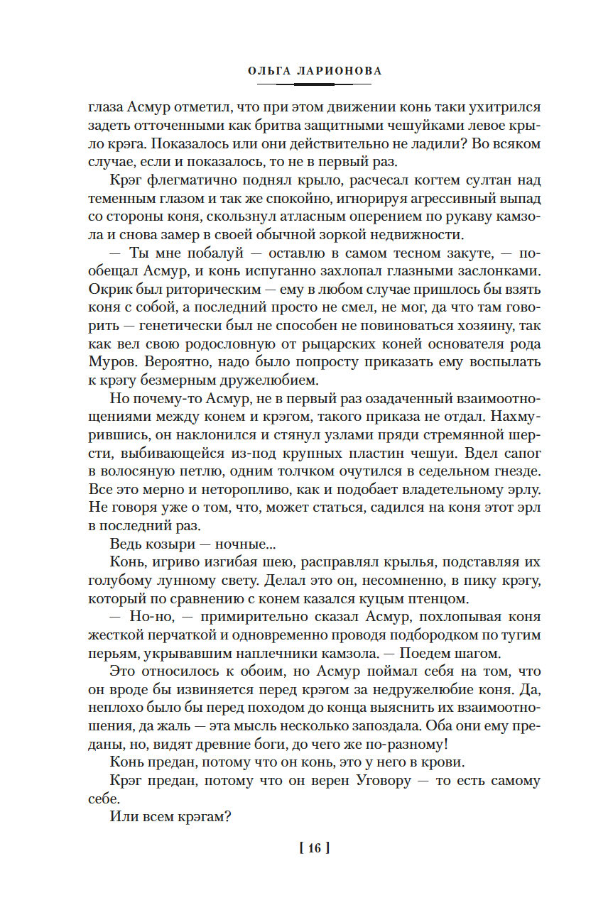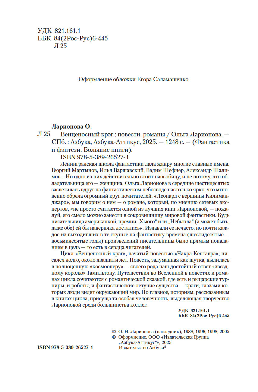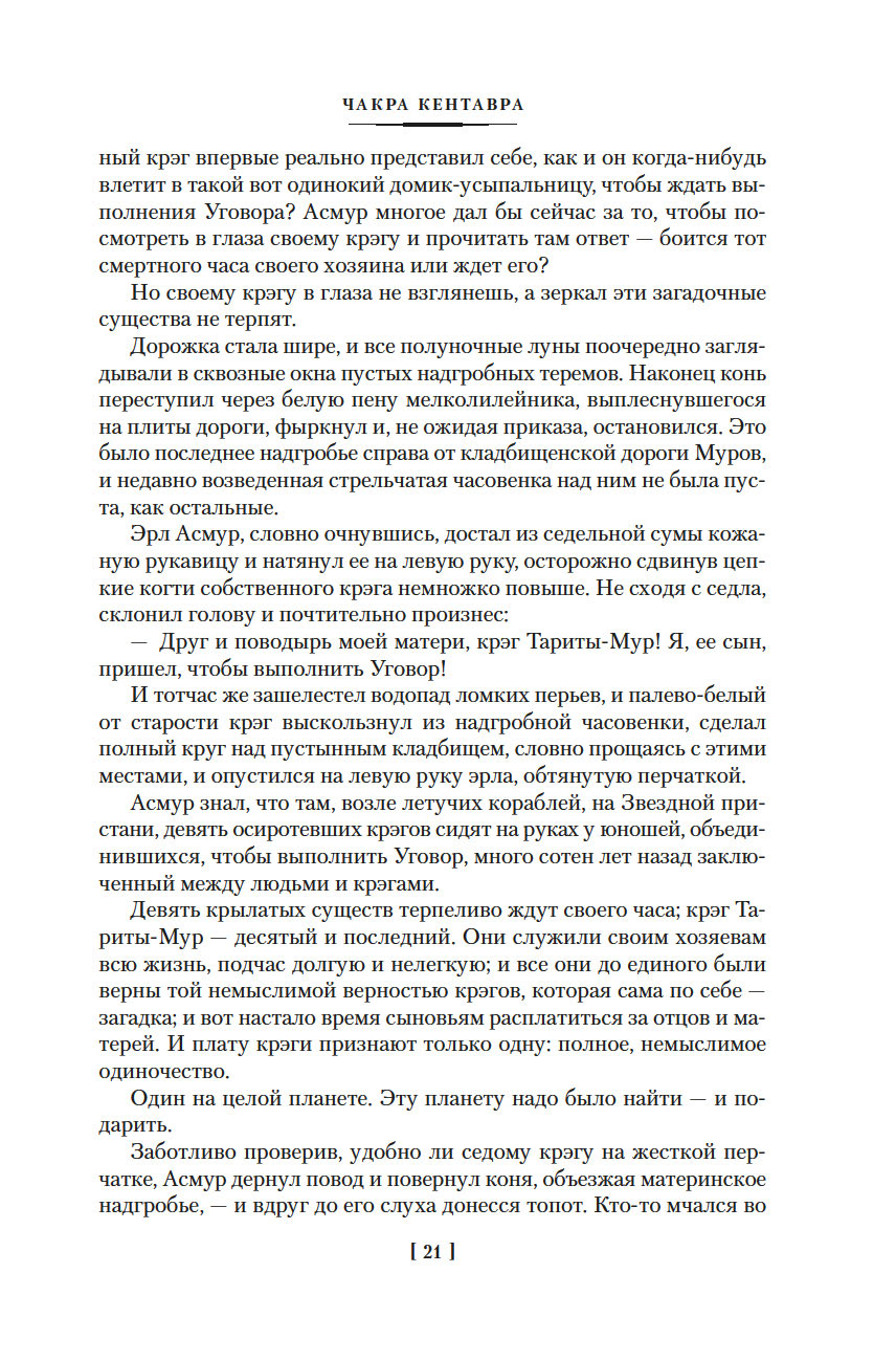 Цикл "Венценосный крэг", начатый повестью "Чакра Кентавра", писался долго, около двадцати лет. Повесть, задуманная как шутка, вылилась в полноценную "космооперу" – своего рода наш достойный ответ "звездному королю" Гамильтону. Путешествия во Вселенной в повестях и романах цикла сочетаются с романтической сказкой, где есть и рыцарские турниры, и роботы, и фантастические летучие существа – крэги, глазами которых люди видят окружающий мир. Но главное, историям, рассказанным в книгах цикла, присуща та особая человечность, выделяющая творчество Ларионовой среди большинства коллег.