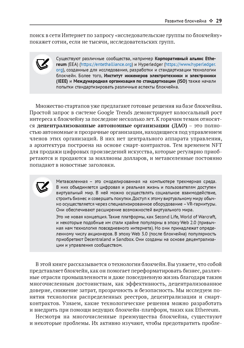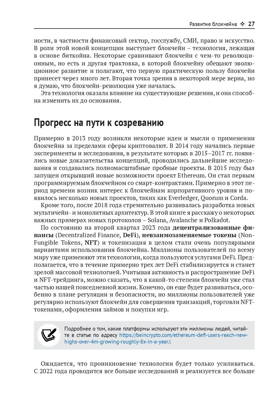 Книга рассказывает о технологии блокчейн, которая служит основой криптовалют, а также применяется в финансах, государственном управлении и во множестве других областей. В новое издание добавлена информация о децентрализованных финансах, децентрализованной идентификации, конфиденциальности, масштабируемости и безопасности блокчейна, а также размещенный на сайте издательства бонусный онлайн-контент, содержащий материалы по альтернативным блокчейнам. Автор делится практическим опытом разработки децентрализованных приложений. На протяжении всей книги рассматриваются решения на основе блокчейна, выходящие за рамки криптовалют, такие как интернет вещей, корпоративные блокчейны и токенизация. Прочитав эту книгу, вы получите глубокое представление о различных аспектах применения блокчейна в некоторых практических сценариях.