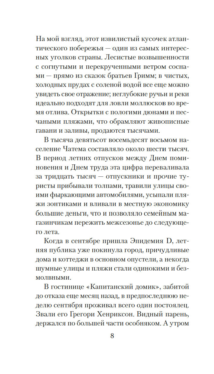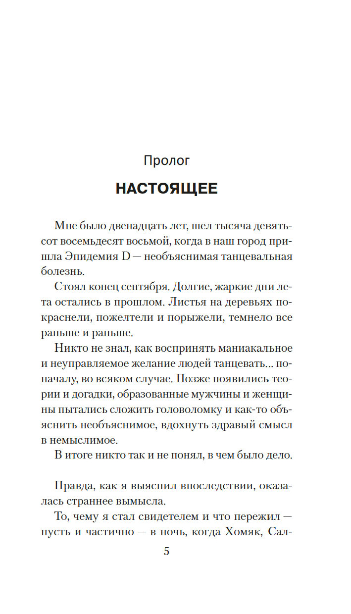 В XVI веке сотни жителей Страсбурга в Эльзасе танцевали целыми днями, не в силах остановиться, и многие падали замертво от истощения. Почти четыреста лет спустя танцевальная эпидемия возвращается, на этот раз в тихий курортный городок на Кейп-Коде. Полиция в замешательстве, в городке расползаются панические слухи, бедствие принимает такие масштабы, что привлекает интерес национальной прессы. А для двенадцатилетнего Бена Грейвса и двух его друзей необъяснимая танцевальная болезнь – лишь предвестник грядущего ужаса.