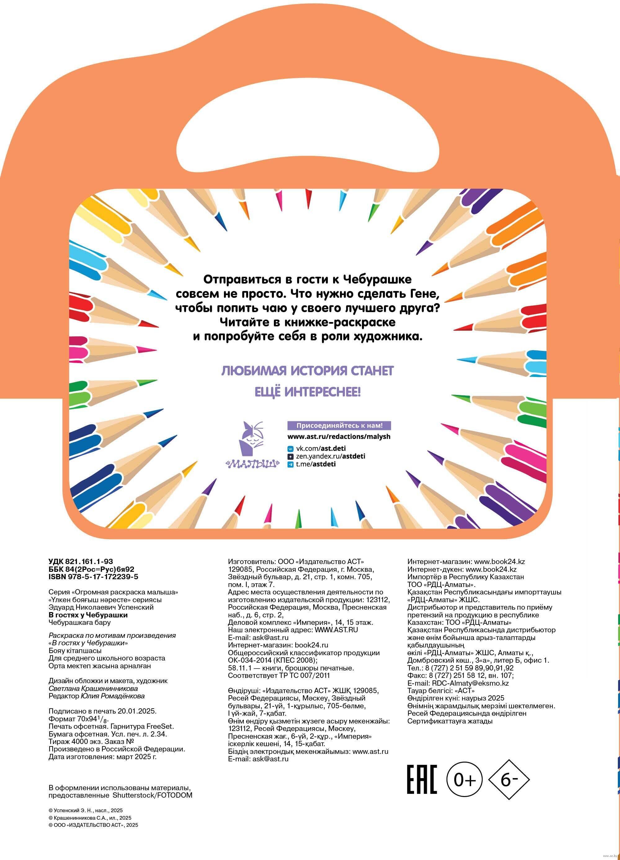 Отправиться в гости к Чебурашке совсем не просто. Что нужно сделать Гене, чтобы попить чаю у своего лучшего друга? Читайте в книжке-раскраске и попробуйте себя в роли художника.