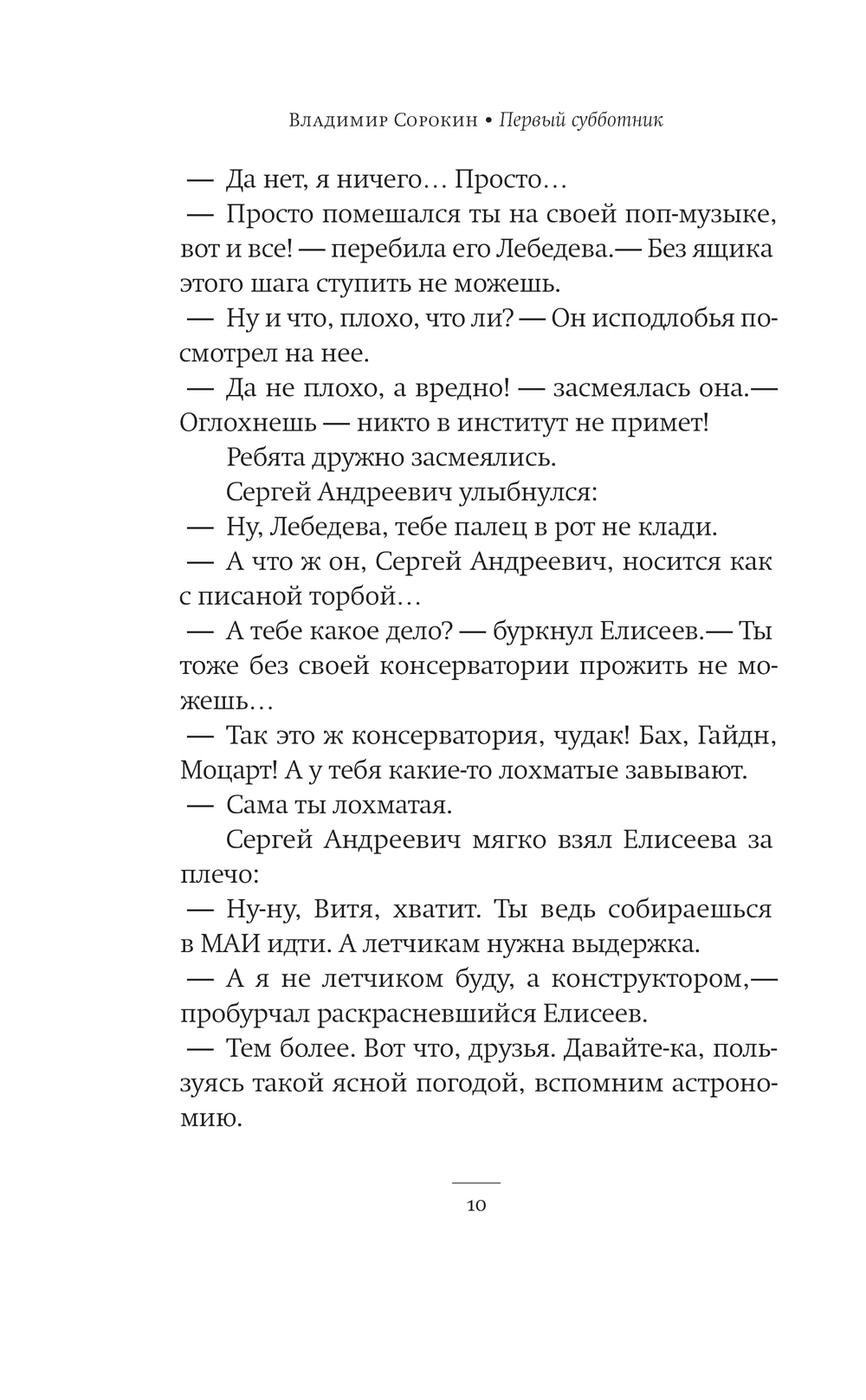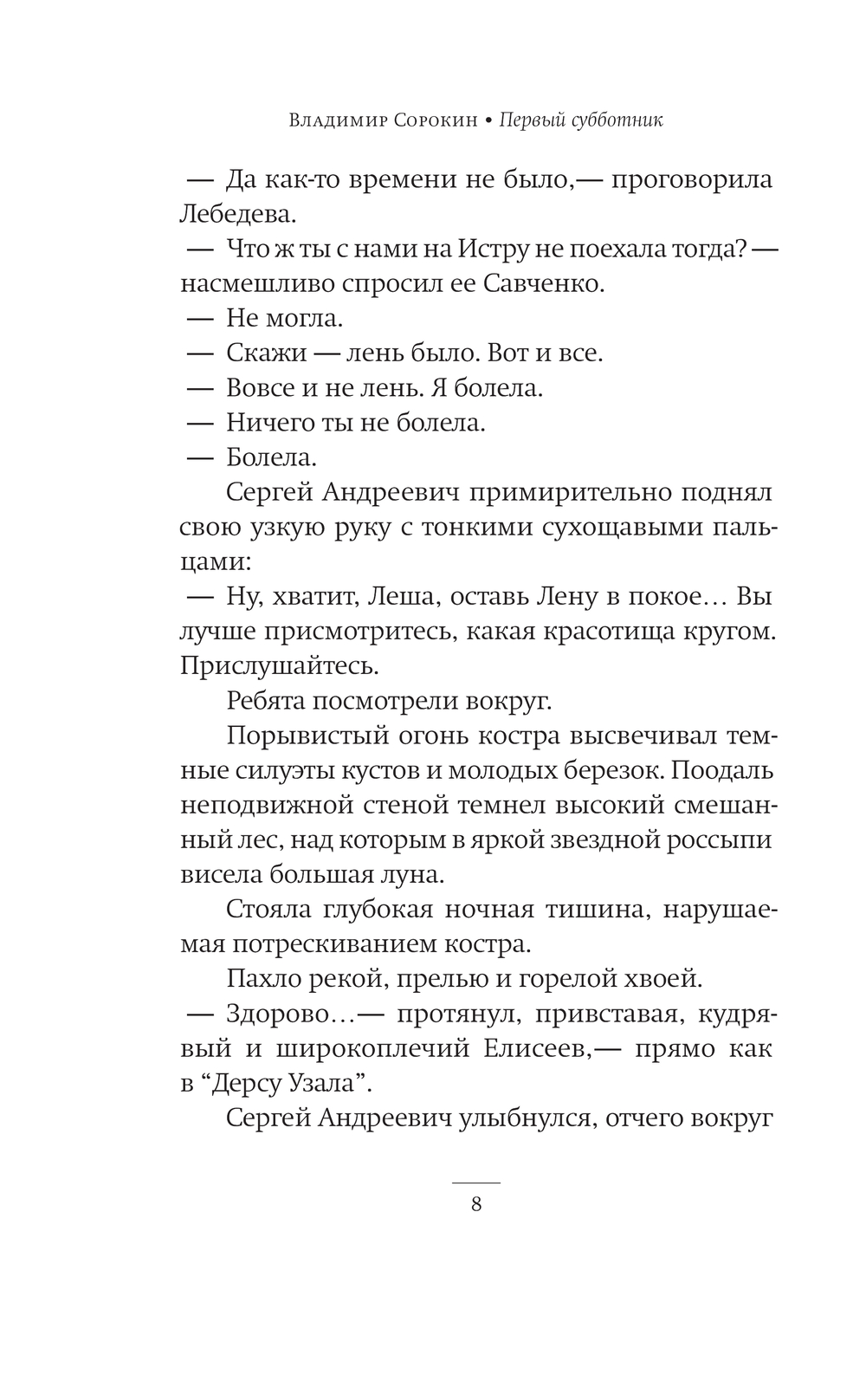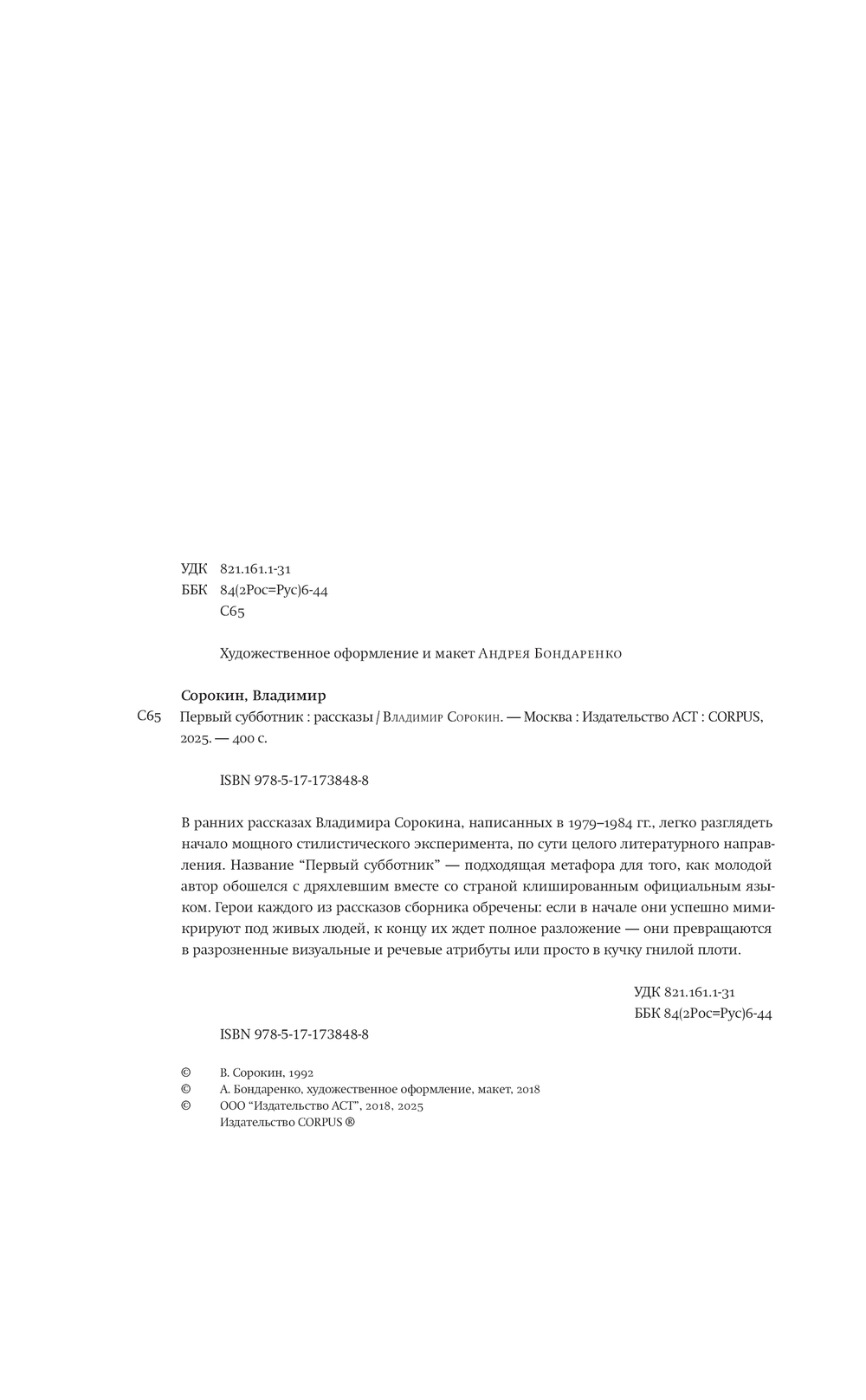 Название "Первый субботник" – подходящая метафора для того, как молодой автор обошелся с дряхлевшим вместе со страной клишированным официальным языком. Герои каждого из рассказов сборника обречены: если в начале они успешно мимикрируют под живых людей, к концу их ждет полное разложение – они превращаются в разрозненные визуальные и речевые атрибуты или просто в кучку гнилой плоти.