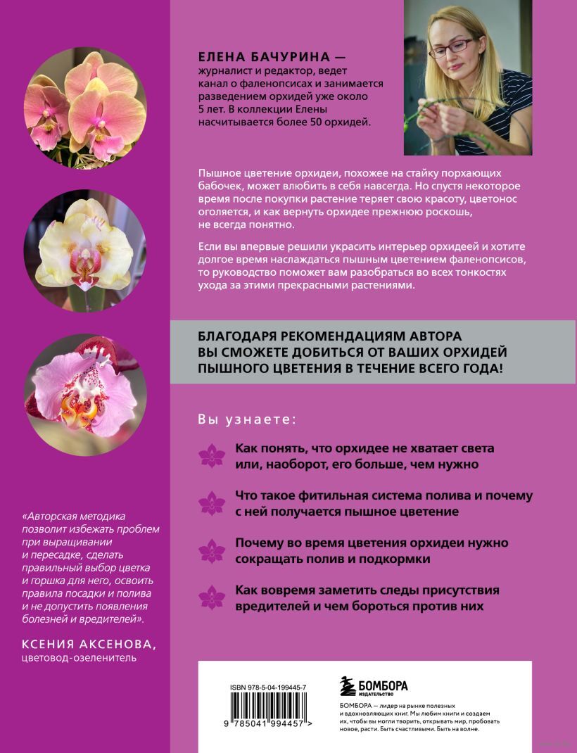 Многим знакома ситуация, когда купленная несколько недель назад невероятной красоты орхидея вдруг начинает терять свое великолепие, тускнеет и становится вялой, и как вернуть ей прежнюю роскошь – не всегда понятно. Эта книга поможет вам разобраться во всех тонкостях ухода за орхидеями: что делать с цветоносом после цветения, нужно ли пересаживать растение сразу после покупки, чем и когда подкармливать и как создать для орхидеи все условия, чтобы она цвела как можно дольше. Авторская методика позволит избежать проблем при выращивании и пересадке, сделать правильный выбор цветка и горшка для него, освоить правила полива и не допустить появления болезней и вредителей.