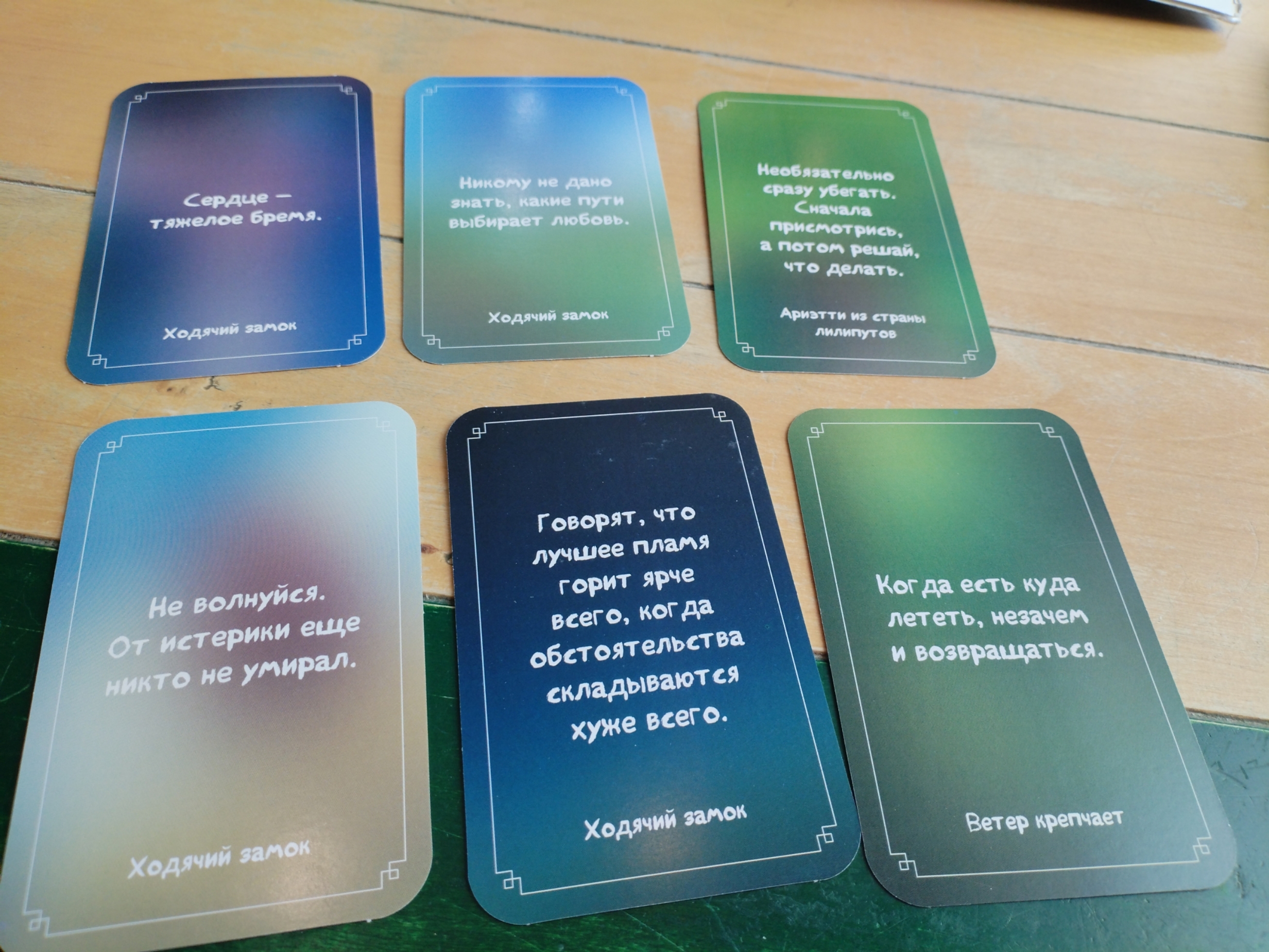 В этих метафорических картах герои из "Моего соседа Тоторо", "Унесенных призраками", "Ведьминой службы доставки" и многих других аниме поделятся своей мудростью и добрыми советами, чтобы помочь вам найти ответы на свои вопросы. Пользоваться ими очень просто: достаньте случайную карту и прислушайтесь к внутреннему отклику на текст и изображение с персонажами из аниме. Их мудрость поможет вам взглянуть на ситуацию с разных сторон и принять решение, а также вдохновит на размышления.