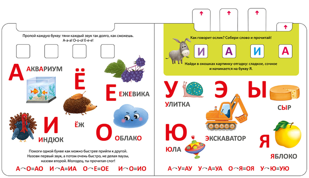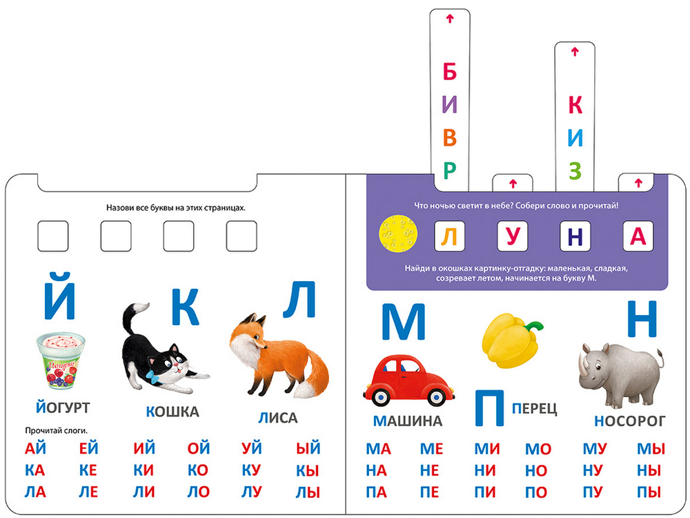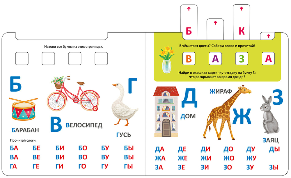 Красочные картинки на каждую букву, много слогов для тренировки чтения, а также интересные задания и загадки. Выполняя задания, передвигайте полоски тренажёра так, чтобы в окошках появились правильные ответы.