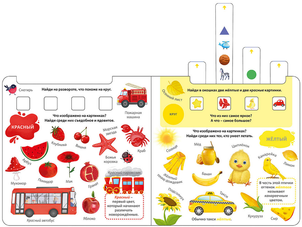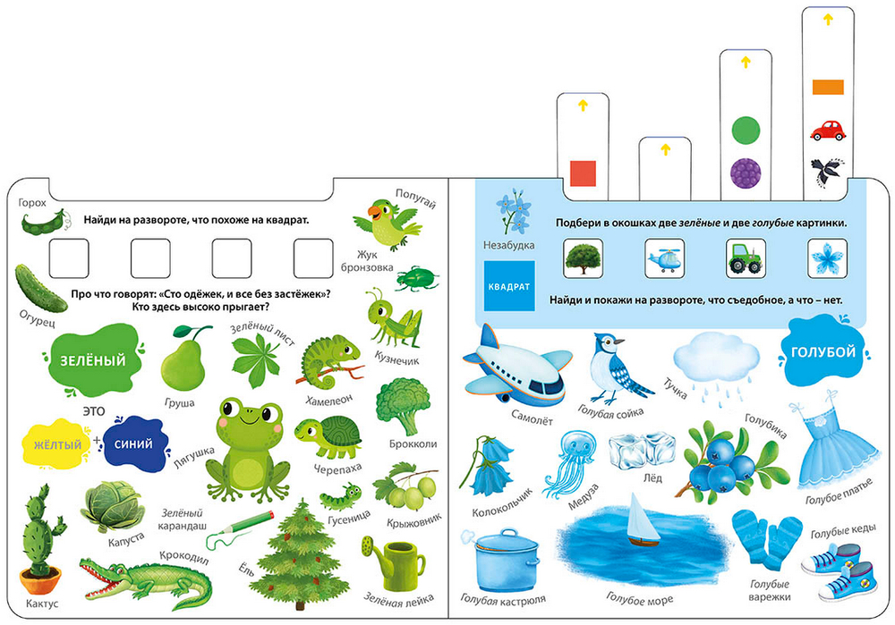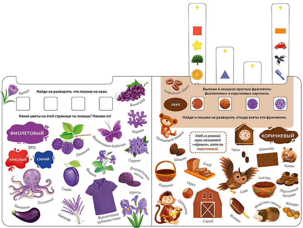 На каждом развороте красочные картинки и много заданий: найди картинку нужного цвета или формы, подбери картинки по сочетанию цветов или фрагменту и т. п.