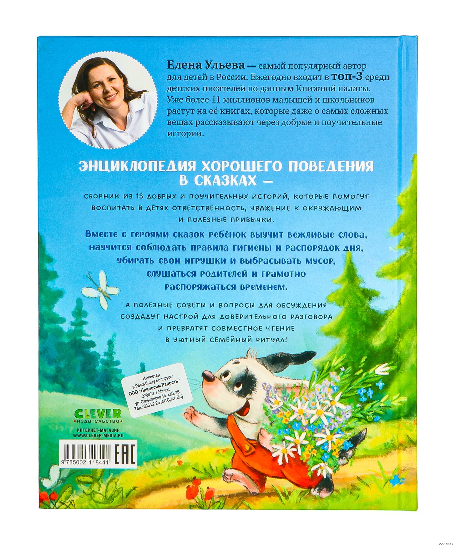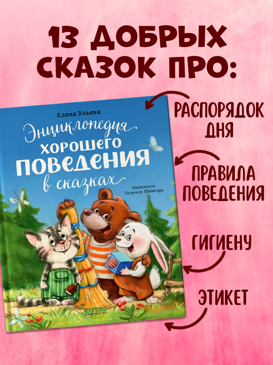 "Энциклопедия хорошего поведения в сказках" – 13 сказочных историй популярного писателя и мастера сказок Елены Ульевой, с которыми ребенок научится следовать правилами этикета, выучит вежливые слова, станет убирать свои игрушки и выбрасывать мусор, слушаться родителей и грамотно распоряжаться временем.