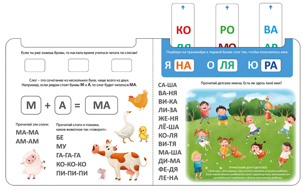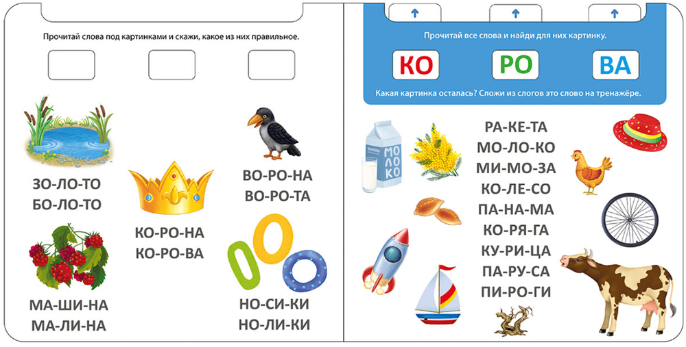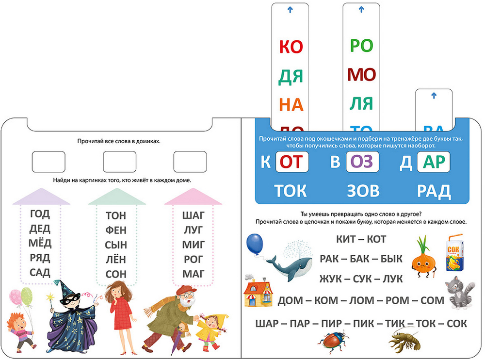 На каждом развороте красочные картинки и интересные задания: подбери к букве слог, прочитай и найди, составь слова из слогов, прочитай наоборот и т. п. Выполняя задания, передвигайте полоски тренажёра так, чтобы в окошках появились правильные ответы.