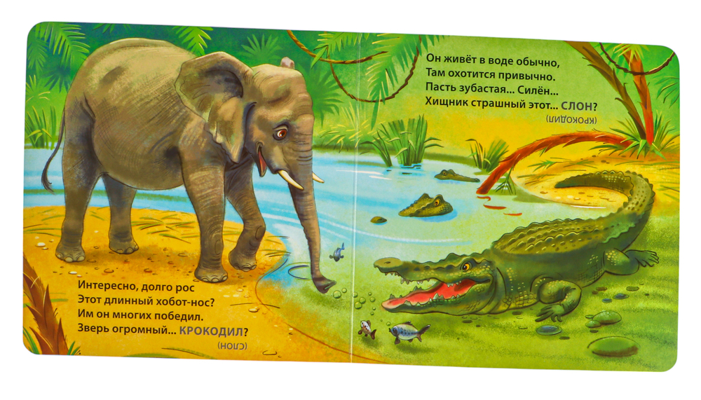 Книжка-картонка Евгения Сосновского познакомит малыша с дикими животными с помощью загадок-обманок.