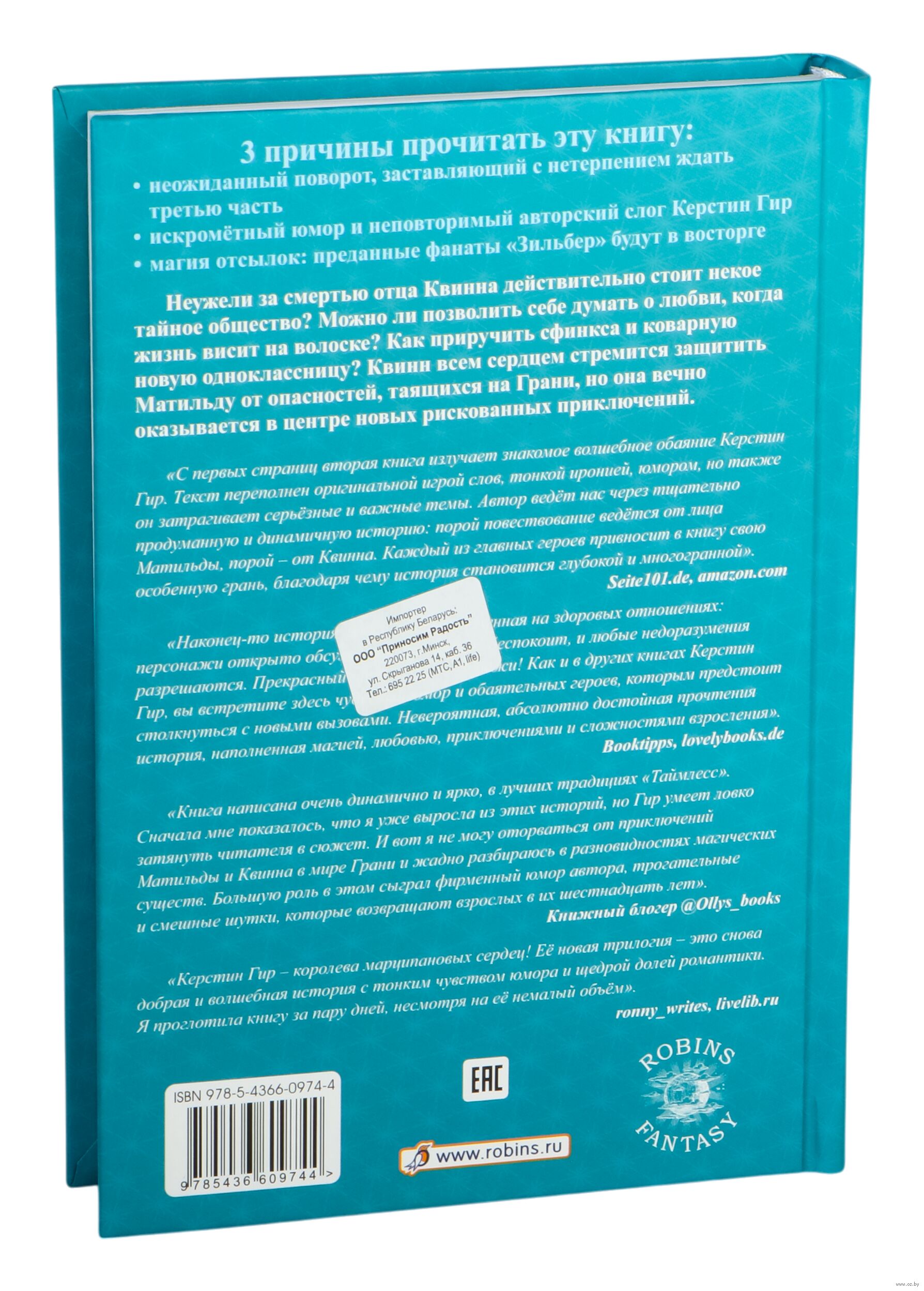 Неужели за смертью отца Квинна действительно стоит некое тайное общество? Можно ли позволить себе думать о любви, когда жизнь висит на волоске? Как приручить сфинкса и коварную новую одноклассницу? Квинн всем сердцем стремится защитить Матильду от опасностей, таящихся на Грани, но она вечно оказывается в центре новых рискованных приключений.
