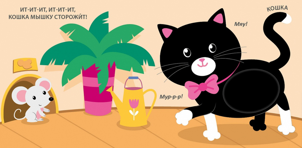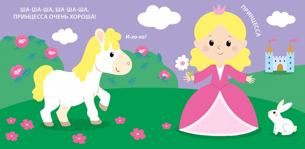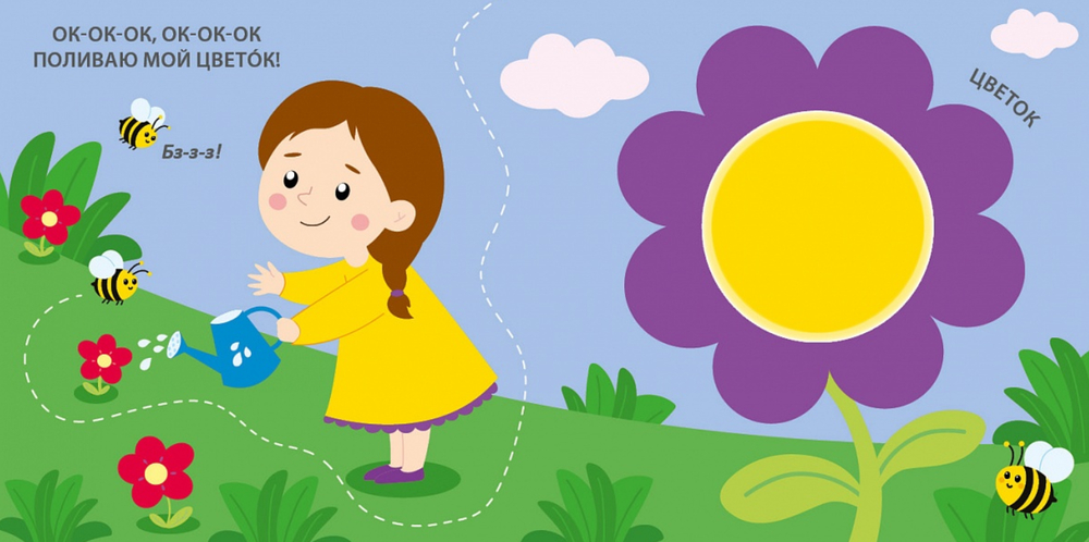 На каждом развороте книги есть тактильная вставка и чистоговорка для запуска и развития речи.