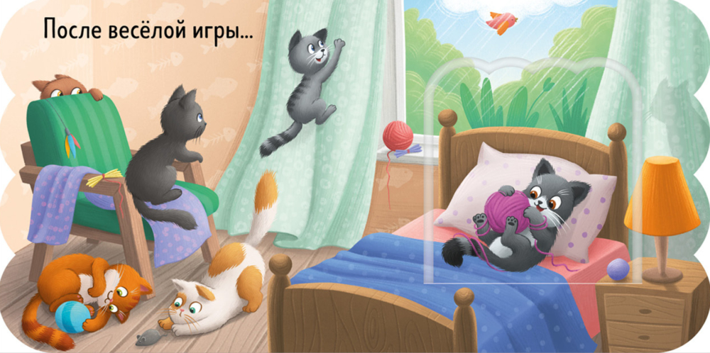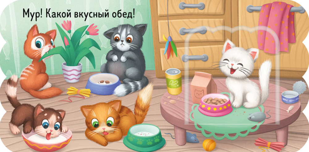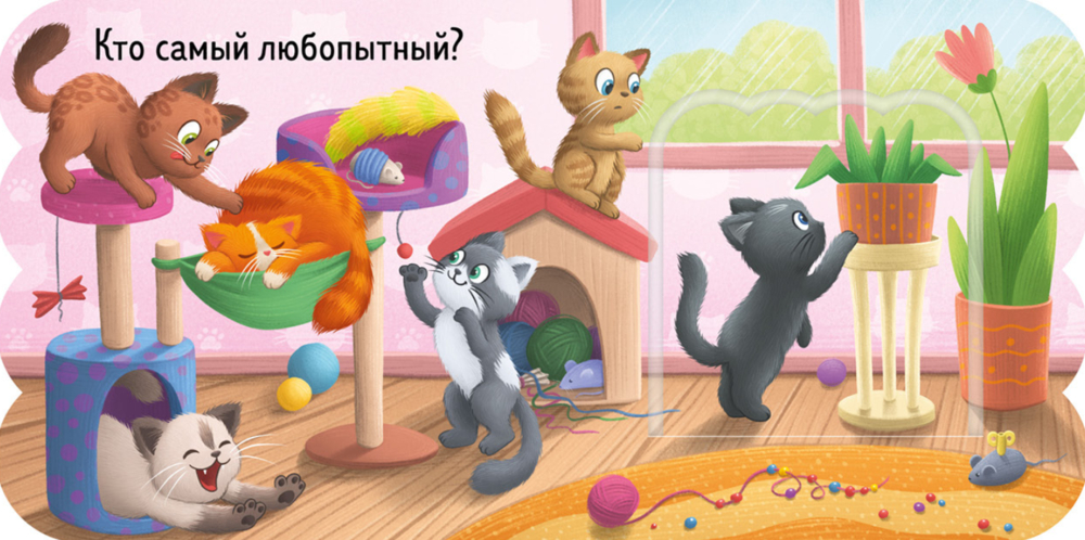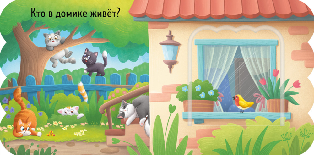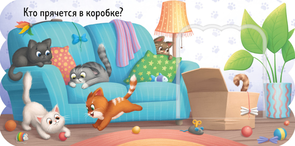 На каждом развороте – яркие иллюстрации, развитие важных навыков и веселая игра с открывающимися створками. Котята играют с клубочком, обедают, бегают в саду, играют в прятки. Задайте малышу вопрос по картинке: "Кто прячется в коробке?" Пусть он откроет створку и найдет ответ-картинку в окошке.