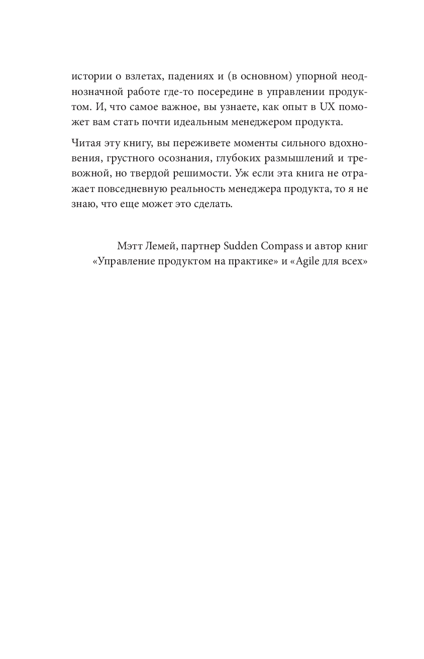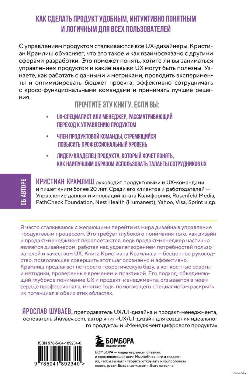 "Управление продуктом для UX-специалистов" Кристиана Крамлиша – это полезное руководство для UX-команд и менеджеров, желающих перейти к управлению продуктом. Книга поможет освоить работу с данными, метриками и бюджетом проекта, расскажет о проведении экспериментов и кросс-функциональном сотрудничестве. Если вы UX-специалист, стремящийся к повышению профессионального уровня, или лидер/владелец продукта, то эта книга для вас.