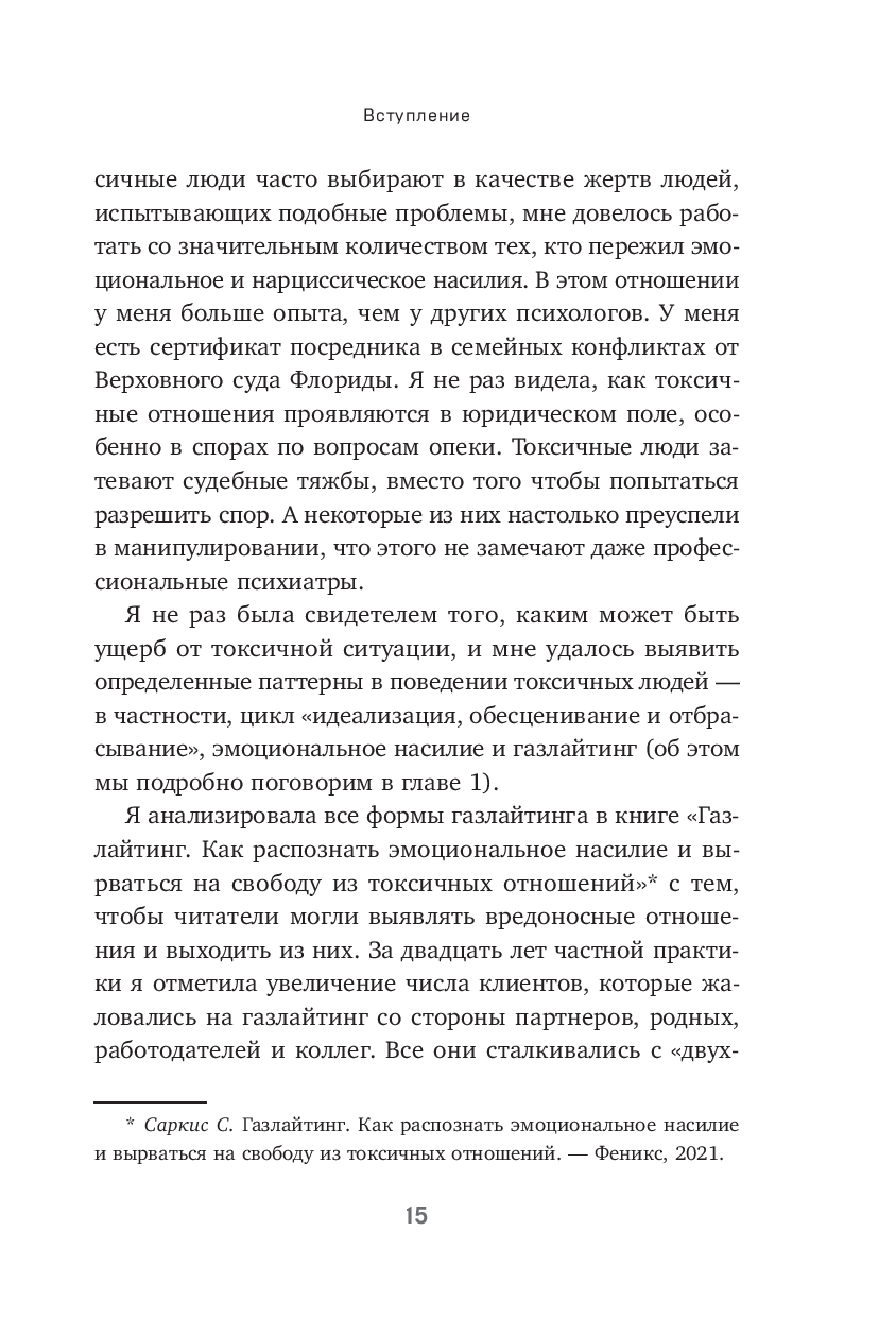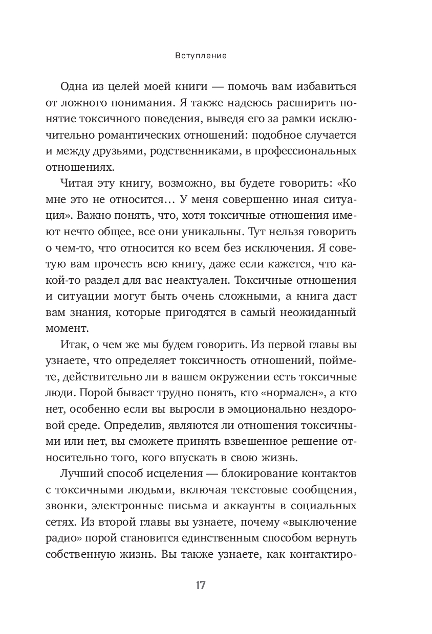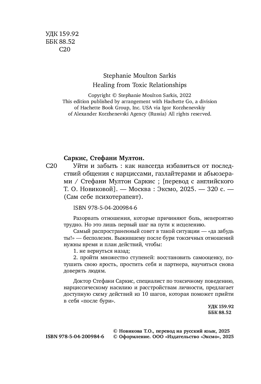 Любой, кто находится в токсичных отношениях – с романтическим партнером, коллегой, членом семьи или другом, – заслуживает бережного отношения. Доктор Саркис дает надежду, поддержку и помощь даже в мельчайших нюансах жизни "после", чтобы исцеление наступило как можно скорее.