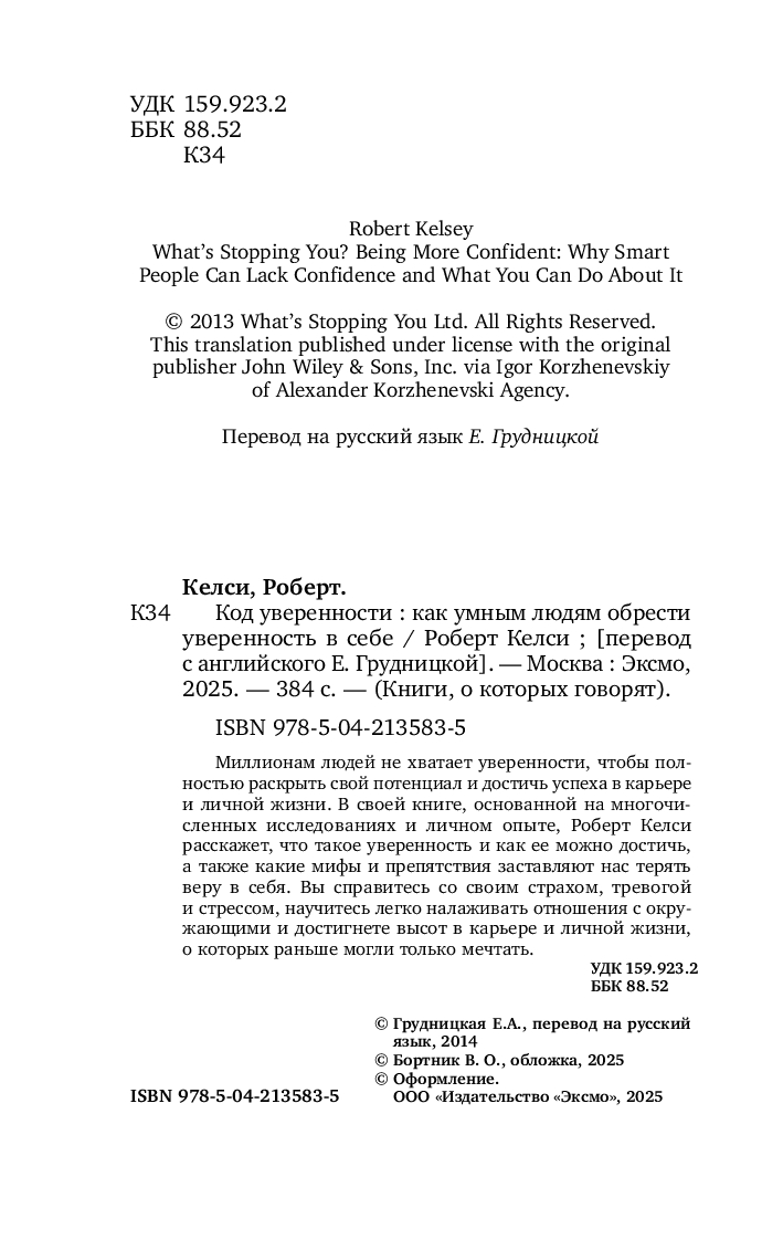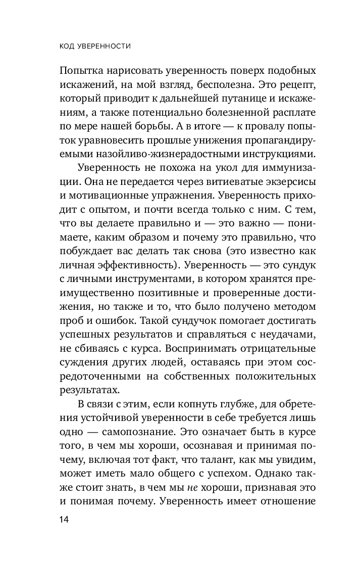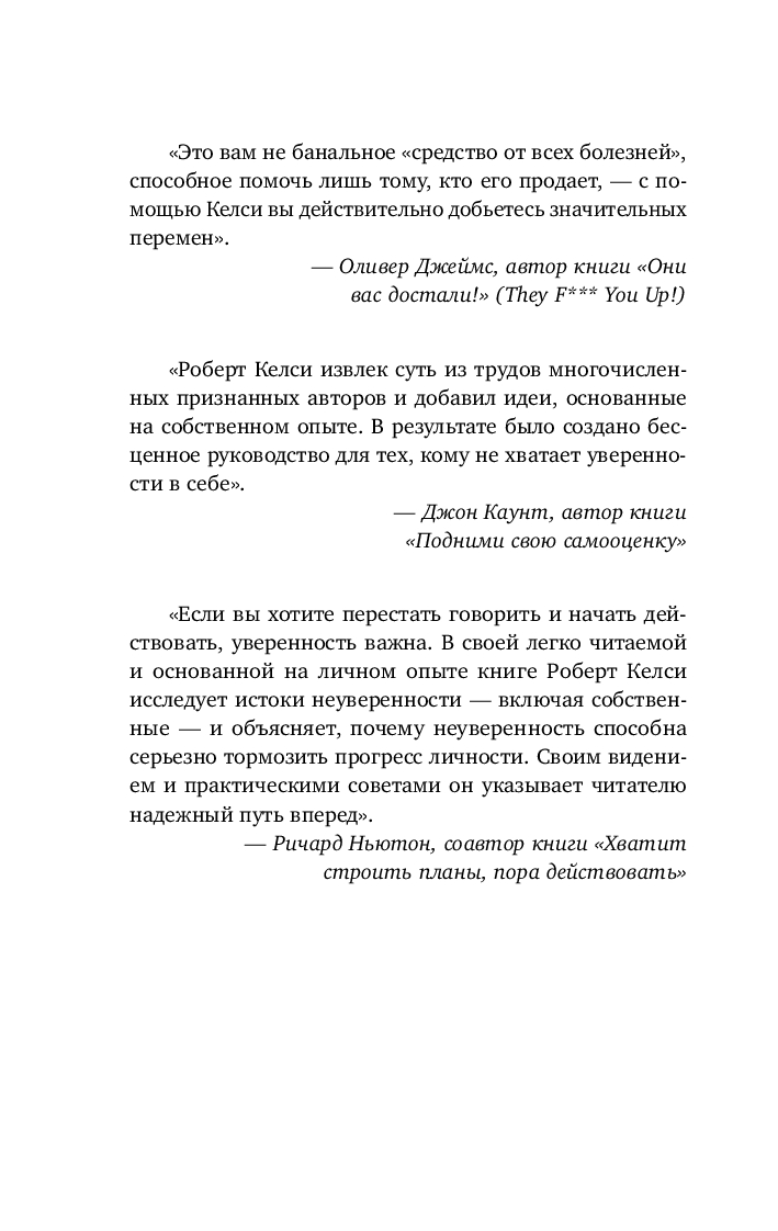 Миллионам людей не хватает уверенности, чтобы полностью раскрыть свой потенциал и достичь успеха в карьере и личной жизни. В своей книге, основанной на многочисленных исследованиях и личном опыте, Роберт Келси расскажет, что такое уверенность и как ее можно достичь, а также какие мифы и препятствия заставляют нас терять веру в себя. Вы справитесь со своим страхом, тревогой и стрессом, научитесь легко налаживать отношения с окружающими и достигнете высот в карьере и личной жизни, о которых раньше могли только мечтать.