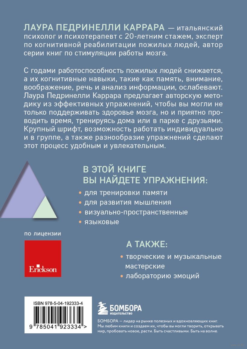 Лаура Педринелли Каррара предлагает авторскую методику из простых и эффективных упражнений, чтобы вы могли не только поддерживать здоровье мозга, но и приятно проводить время. Благодаря разнообразным упражнениям этот процесс станет увлекательным. Книга будет полезна и тем, кто работает с пожилыми людьми в специализированных учреждениях или ухаживает за родственниками.