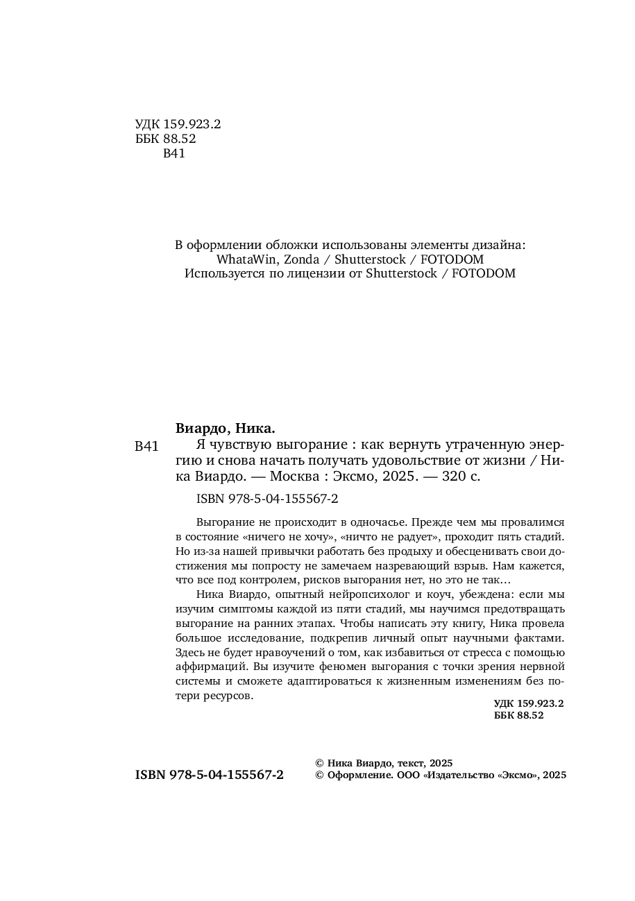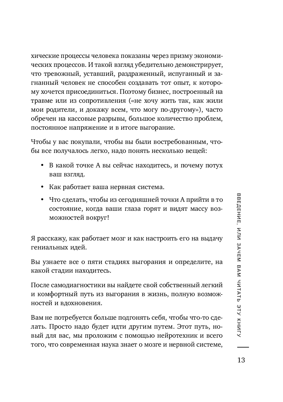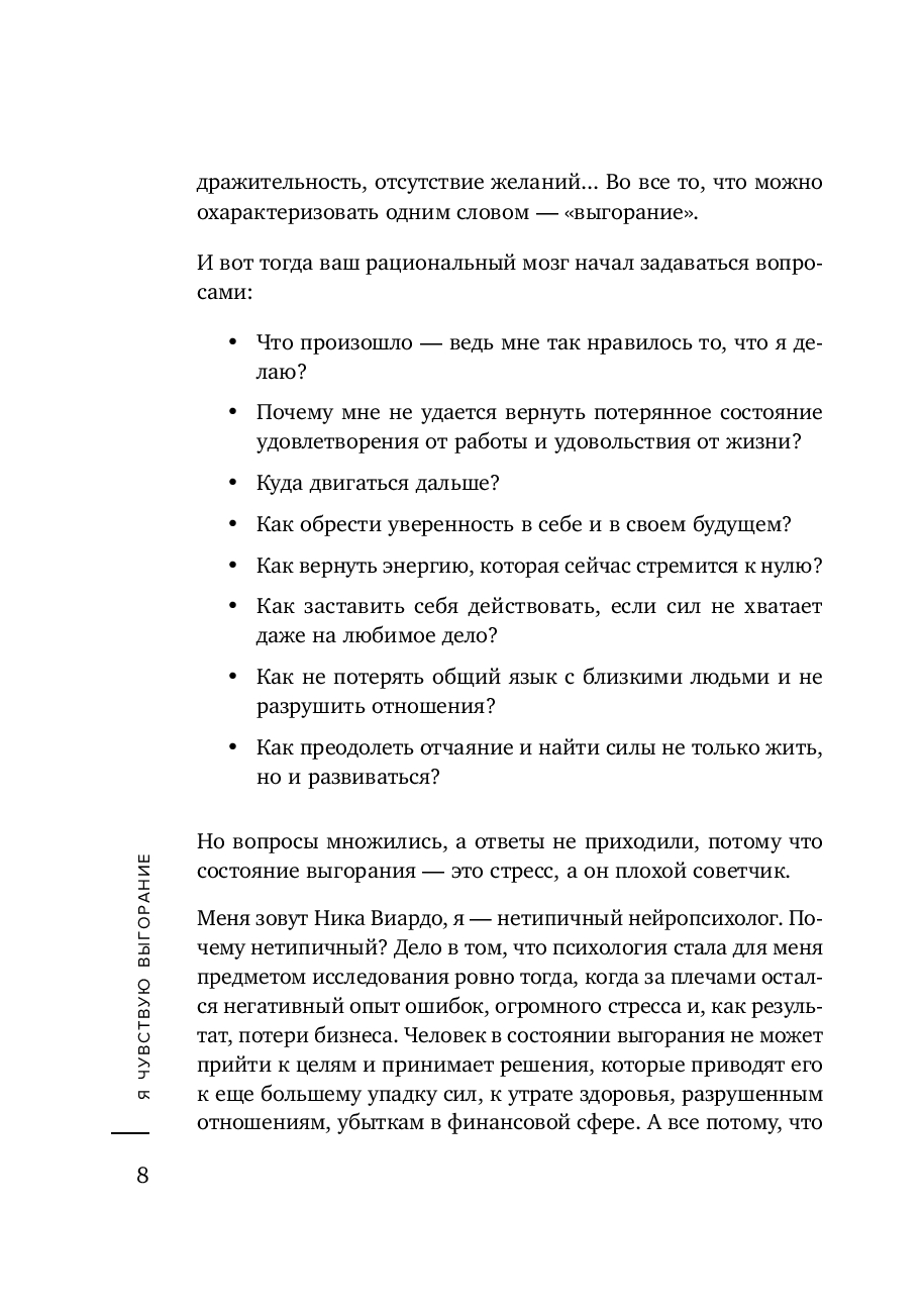 Ника Виардо, опытный нейропсихолог и коуч, убеждена: если мы изучим симптомы каждой из пяти стадий, мы научимся предотвращать выгорание на ранних этапах. Чтобы написать эту книгу Ника провела большое исследование, подкрепив личный опыт научными фактами. Здесь не будет нравоучений о том, как избавиться от стресса с помощью аффирмаций. Вы изучите феномен выгорания с точки зрения нервной системы и сможете адаптироваться к жизненным изменениям без потери ресурсов.