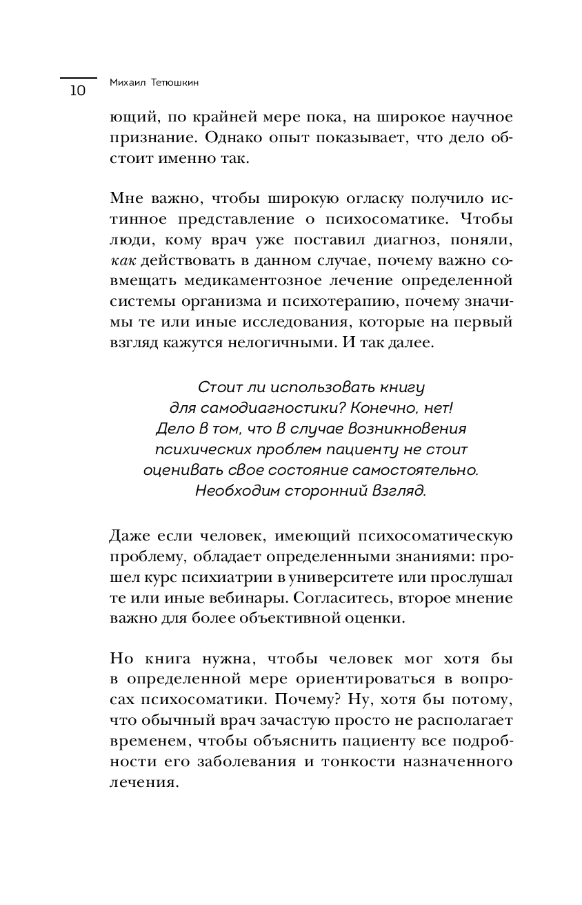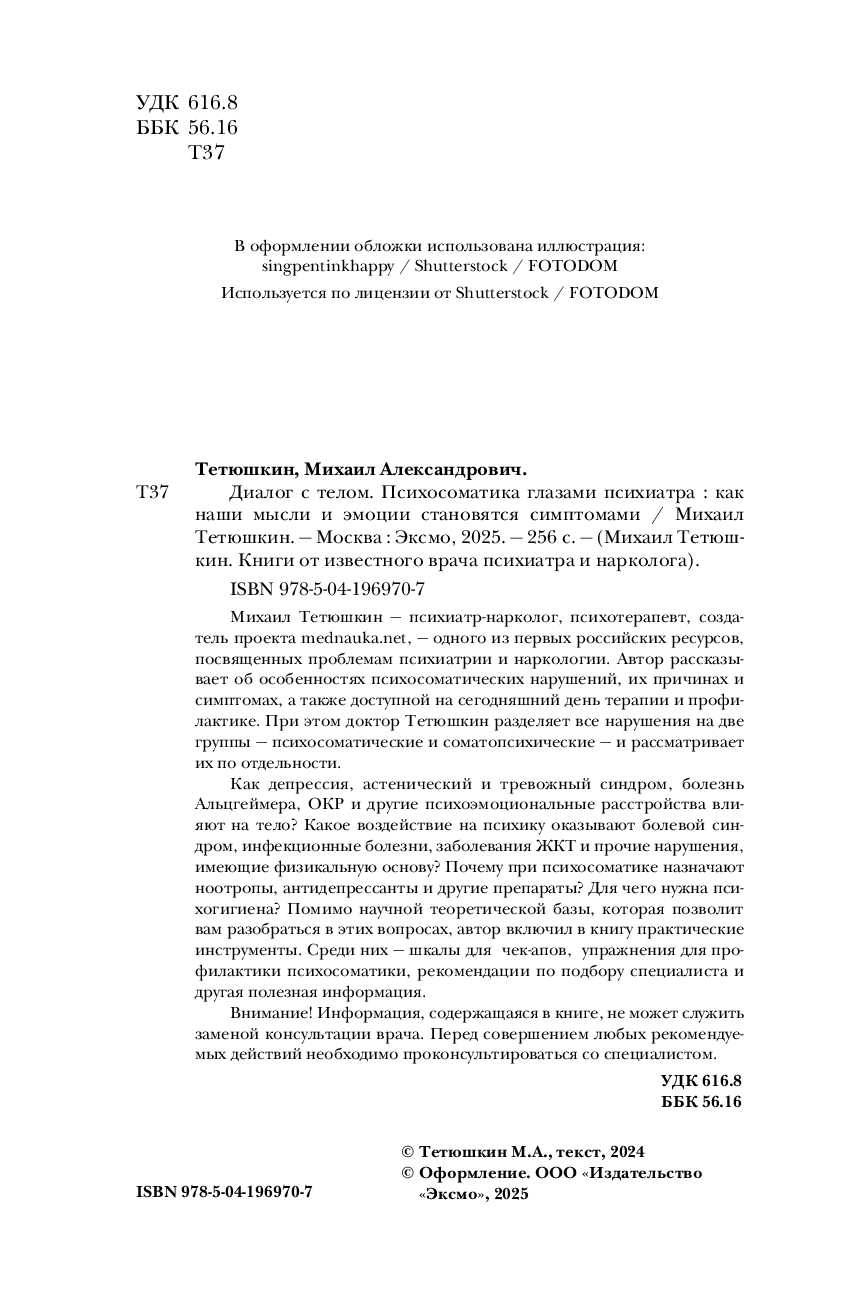 Михаил Тетюшкин – психиатр-нарколог, психотерапевт, создатель проекта mednauka.net, – одного из первых российских ресурсов, посвященных проблемам психиатрии и наркологии. Автор рассказывает об особенностях психосоматических нарушений, их причинах и симптомах, а также доступной на сегодняшний день терапии и профилактике. При этом доктор Тетюшкин разделяет все нарушения на две группы – психосоматические и соматопсихические – и рассматривает их по отдельности.