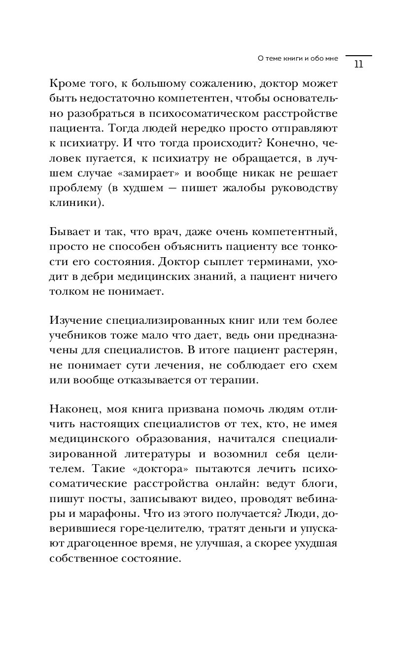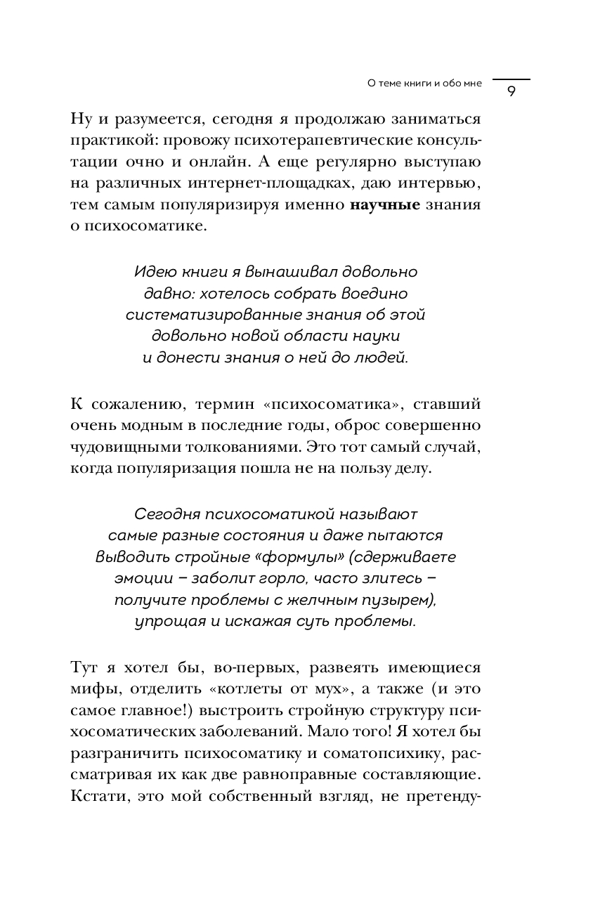 Как депрессия, астенический и тревожный синдром, болезнь Альцгеймера, ОКР и другие психоэмоциональные расстройства влияют на тело? Какое воздействие на психику оказывают болевой синдром, инфекционные болезни, заболевания ЖКТ и прочие нарушения, имеющие физикальную основу? Почему при психосоматике назначают ноотропы, антидепрессанты и другие препараты? Для чего нужна психогигиена? Помимо научной теоретической базы, которая позволит вам разобраться в этих вопросах, автор включил в книгу практические инструменты. Среди них – шкалы для чек-апов, упражнения для профилактики психосоматики, рекомендации по подбору специалиста и другая полезная информация.