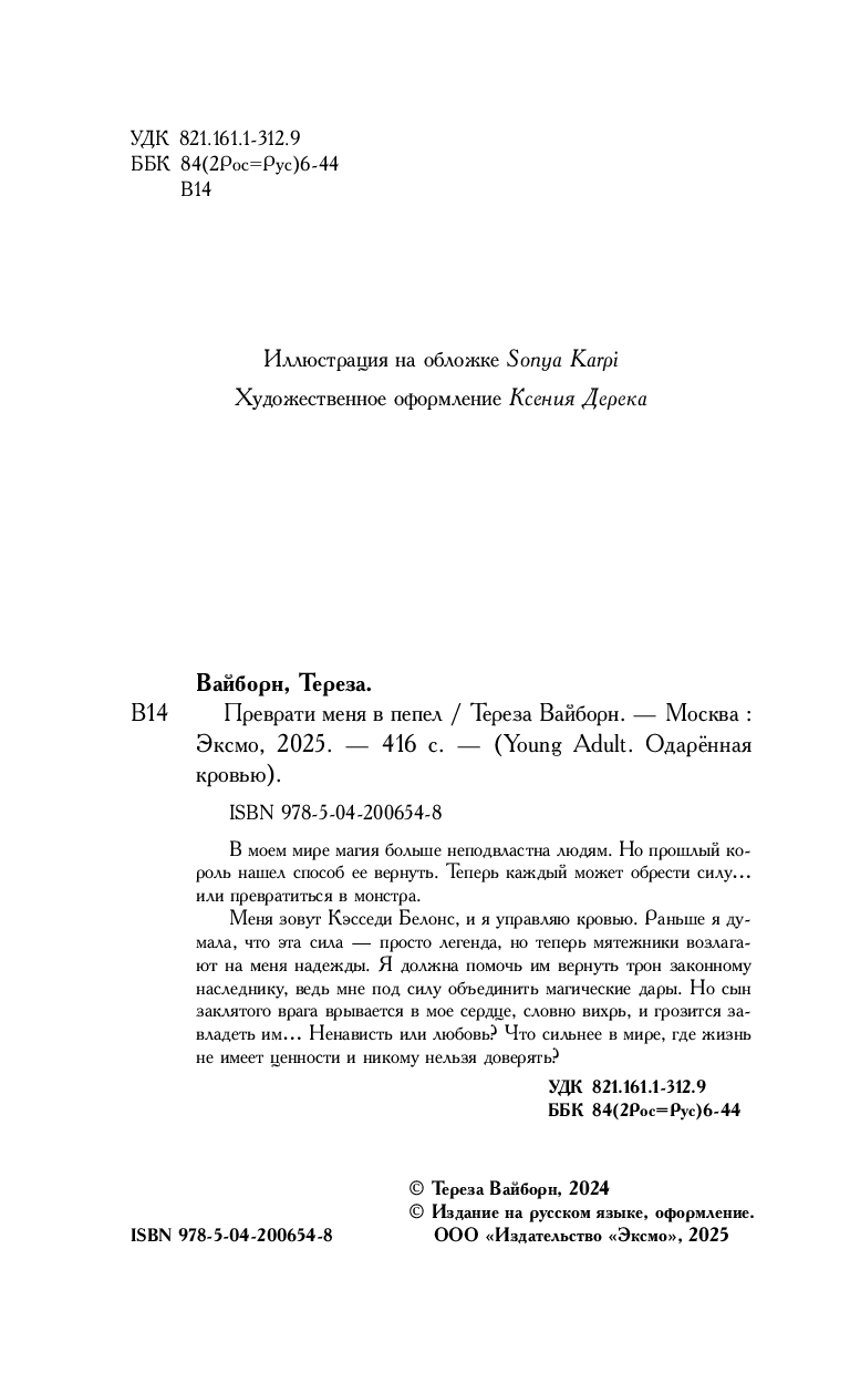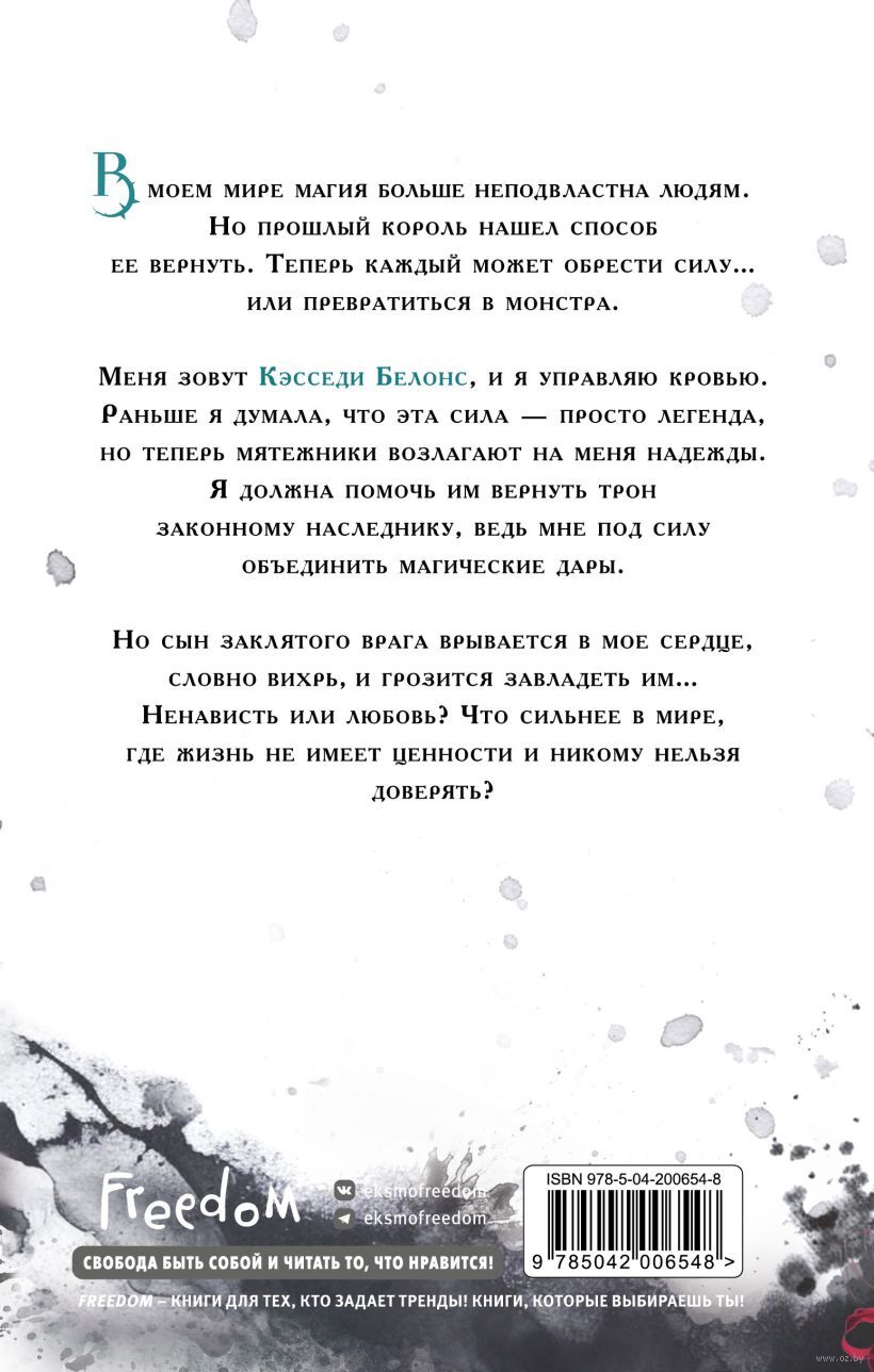 Меня зовут Кэсседи Белонс, и я управляю кровью. Раньше я думала, что эта сила – просто легенда, но теперь мятежники возлагают на меня надежды. Я должна помочь им вернуть трон законному наследнику, ведь мне под силу объединить магические дары. Но сын заклятого врага врывается в мое сердце словно вихрь и грозится завладеть им... Ненависть или любовь? Что сильнее в мире, где жизнь не имеет ценности и никому нельзя доверять?