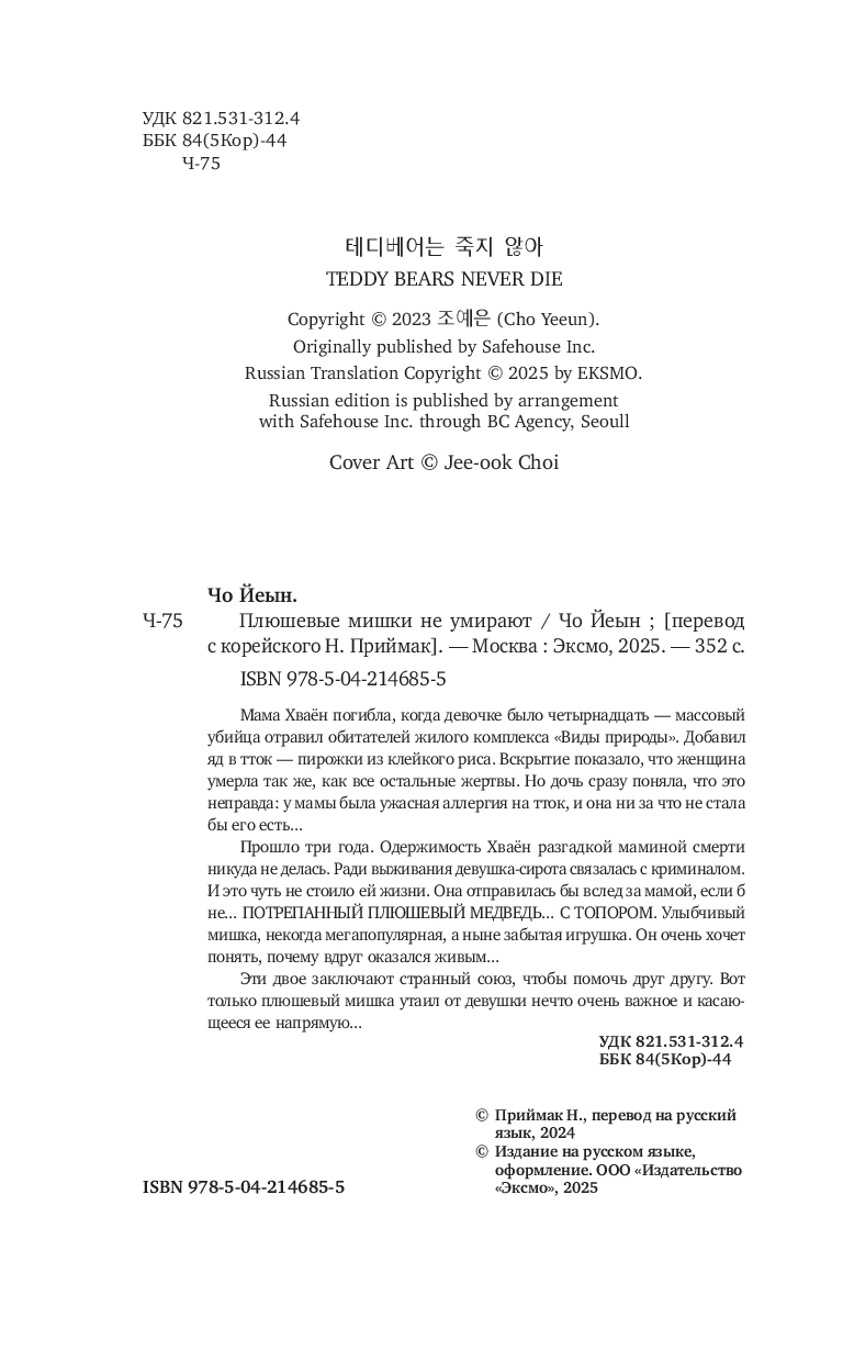 Прошло три года. Одержимость Хваён разгадкой маминой смерти никуда не делась. Ради выживания девушка-сирота связалась с криминалом. И это чуть не стоило ей жизни. Она отправилась бы вслед за мамой, если б не... ПОТРЕПАННЫЙ ПЛЮШЕВЫЙ МЕДВЕДЬ... С ТОПОРОМ. Улыбчивый мишка, некогда мегапопулярная, а ныне забытая игрушка. Он очень хочет понять, почему вдруг оказался живым...