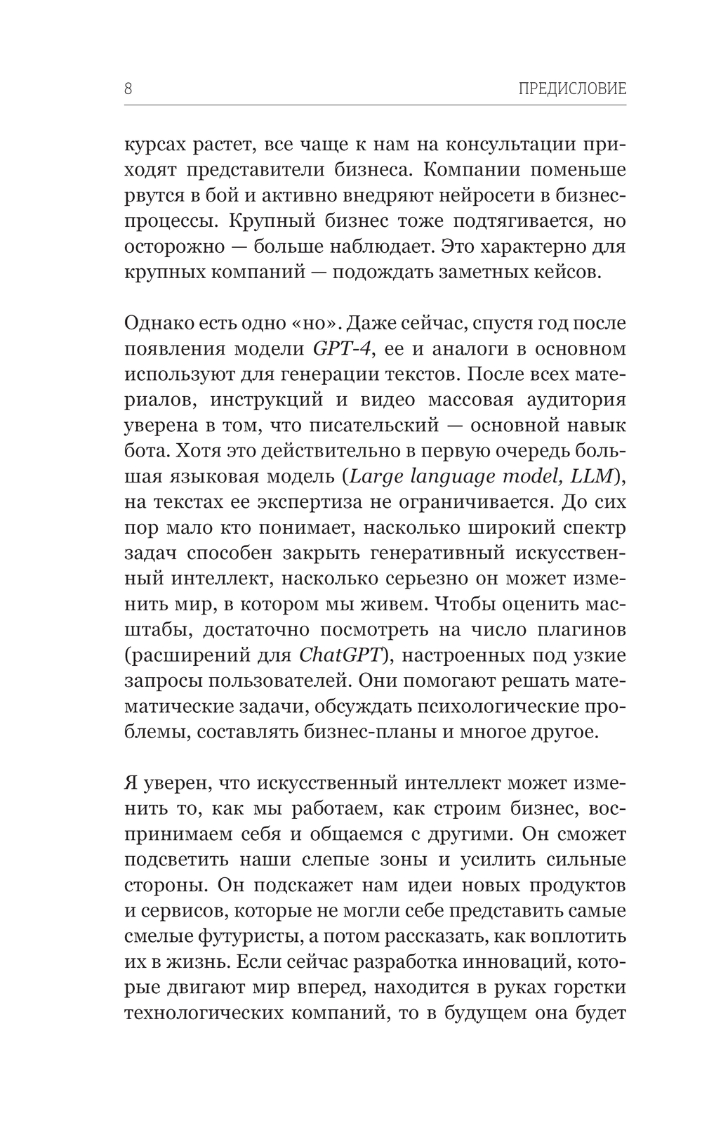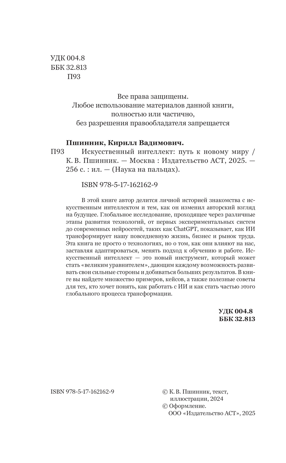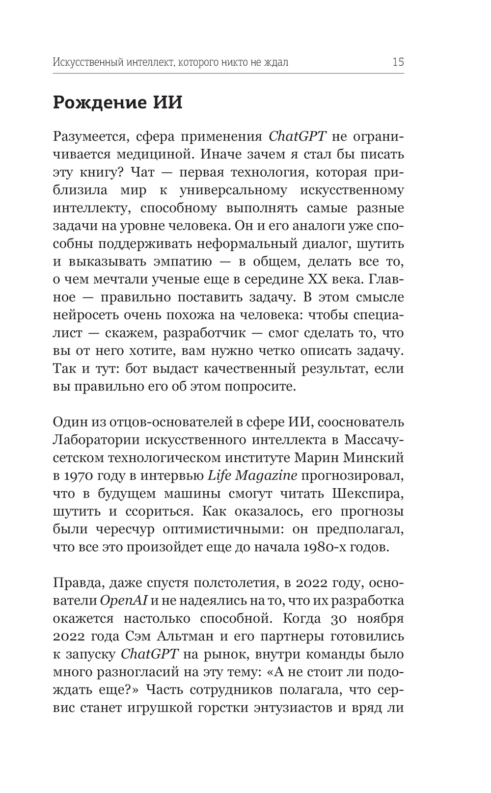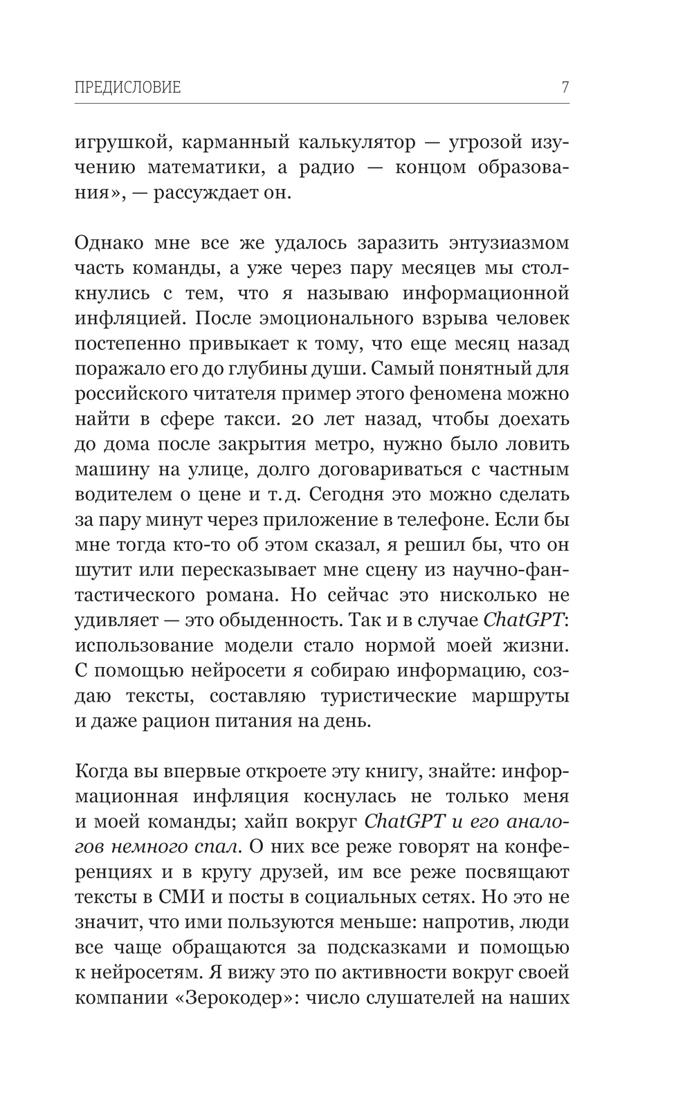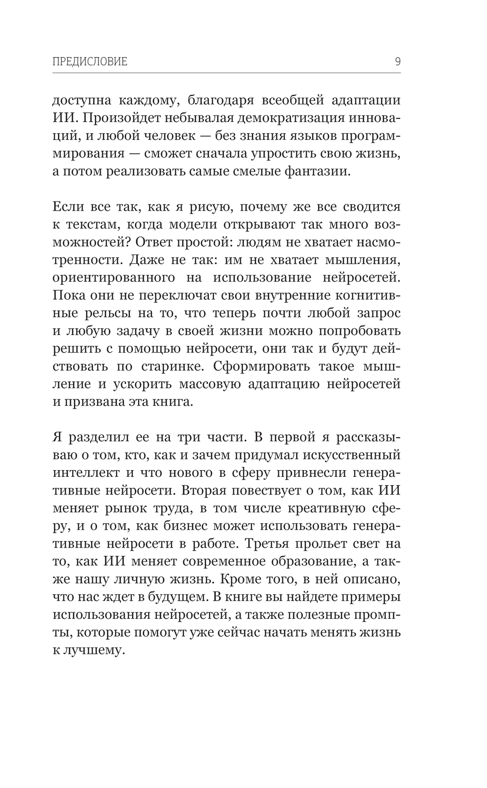 В этой книге автор делится личной историей знакомства с искусственным интеллектом и тем, как он изменил авторский взгляд на будущее. Глобальное исследование, проходящее через различные этапы развития технологий, от первых экспериментальных систем до современных нейросетей, таких как ChatGPT, показывает, как ИИ трансформирует нашу повседневную жизнь, бизнес и рынок труда. Эта книга не просто о технологиях, но о том, как они влияют на нас, заставляя адаптироваться, менять подход к обучению и работе. Искусственный интеллект – это новый инструмент, который может стать "великим уравнителем", дающим каждому возможность развивать свои сильные стороны и добиваться больших результатов. В книге вы найдете множество примеров, кейсов, а также полезные советы для тех, кто хочет понять, как работать с ИИ и как стать частью этого глобального процесса трансформации.