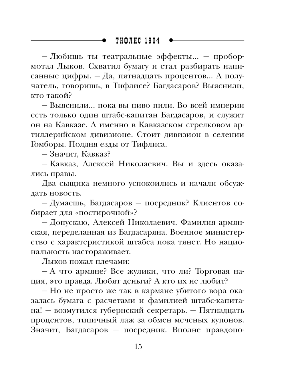 Полиция давно подозревала, что где-то на окраине империи существует особое преступное предприятие, помогающее бандитам отмывать меченые деньги и ценные бумаги. "Большая постирочная" – так называли его сыщики. Как только у Департамента полиции появилась ниточка, ведущая в Тифлис, Лыков выехал на Кавказ проводить дознание... На месте выяснилось, что услугами Тифлисского казначейства по отмывке краденых денег пользовались мошенники, бандиты и террористы со всей страны. Расследование столичного гостя пришлось не по нраву главарям "постирочной". Едва Лыков приступил к дознанию, как один за другим начали погибать важные свидетели. Кто-то явно уводил сыщика с верного пути... и вел прямиком к смерти.