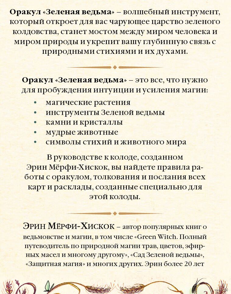 Оракул "Зеленая ведьма" Эрин Мёрфи-Хискок – волшебный инструмент, который откроет для вас чарующее царство зеленого колдовства, станет мостом между миром человека и миром природы и укрепит вашу глубинную связь с природными стихиями.