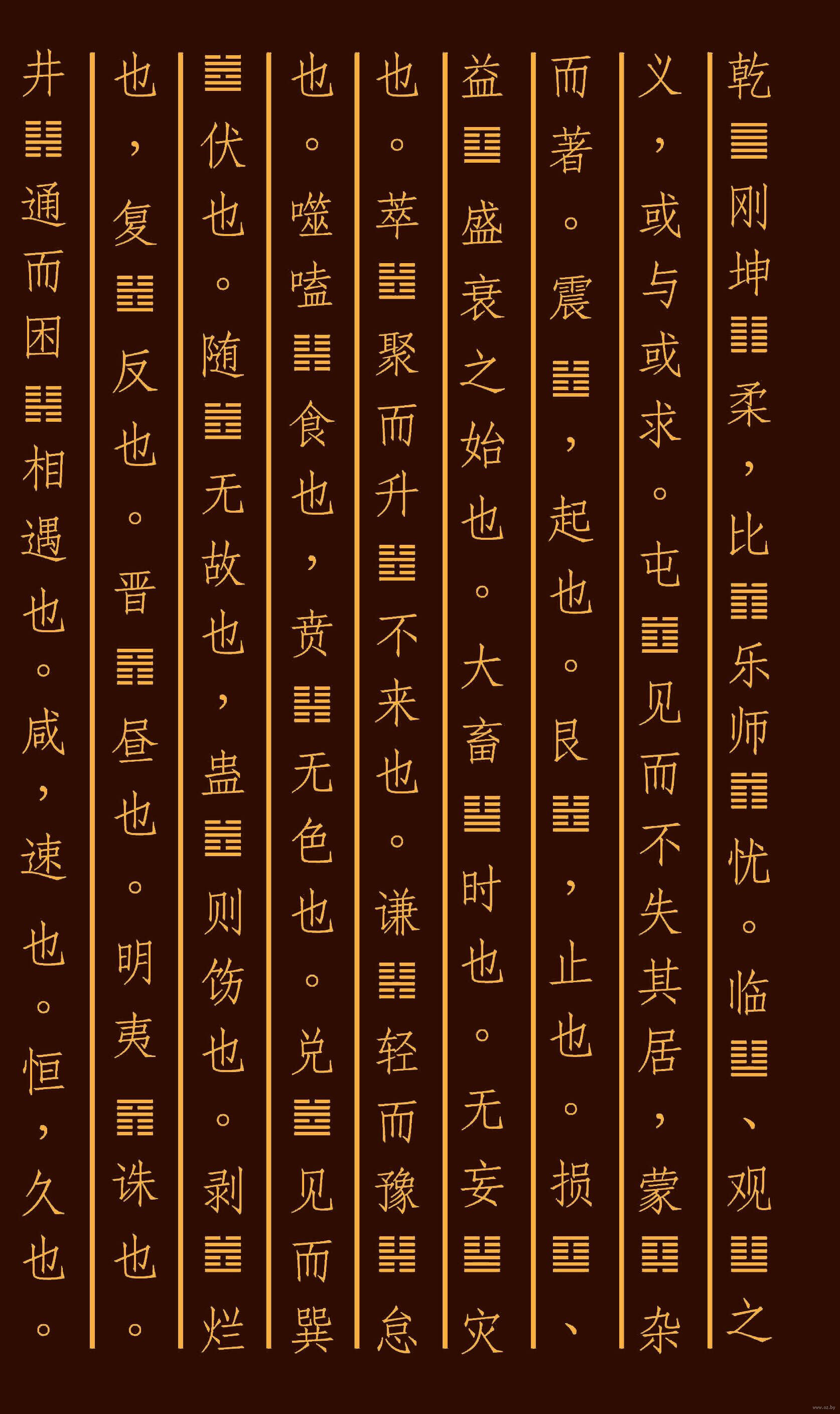Книга Перемен состоит из самих знаков, их названий, слов к знакам, слов к уровням и толкований, так называемых "Десяти крыльев", которые были созданы Конфуцием.