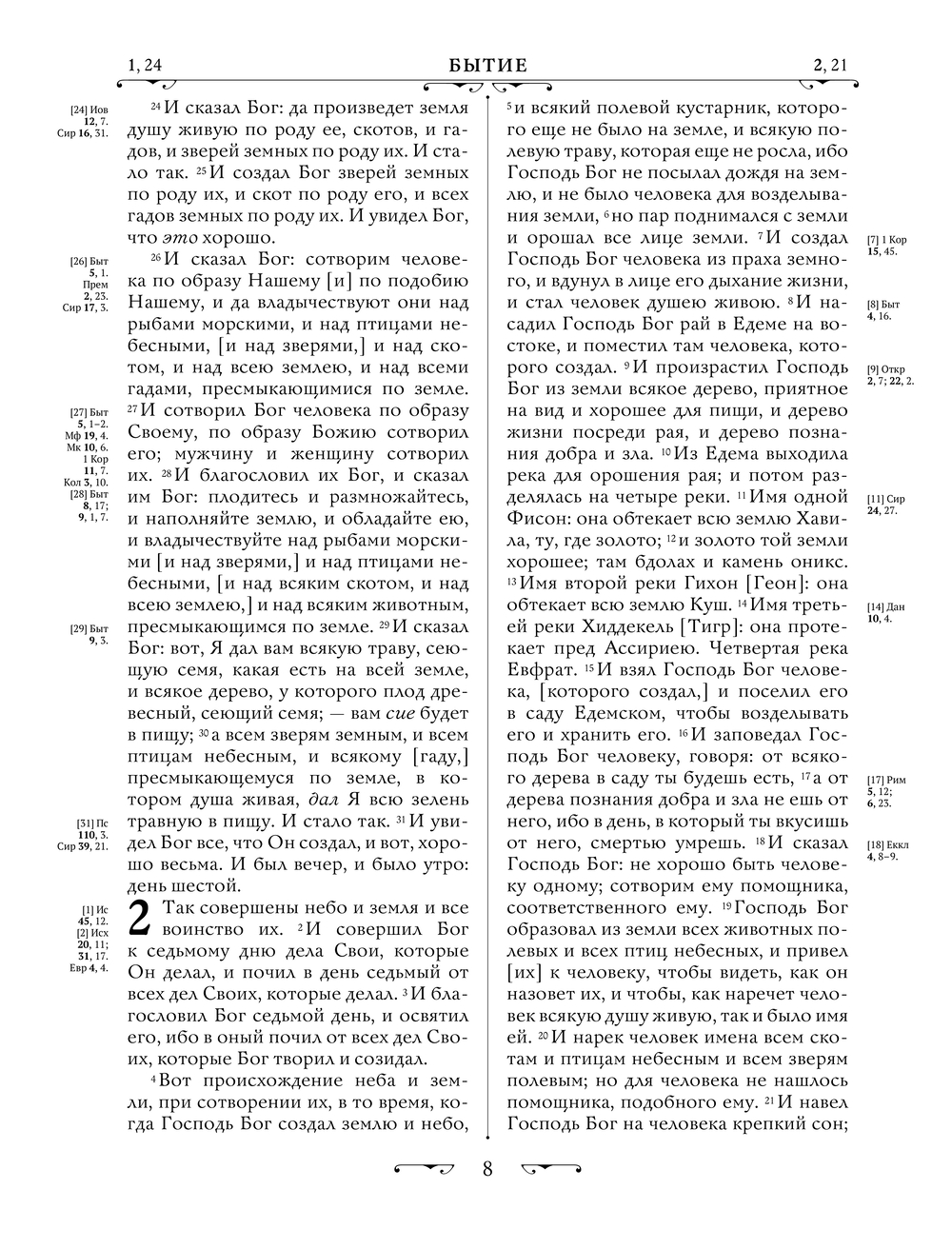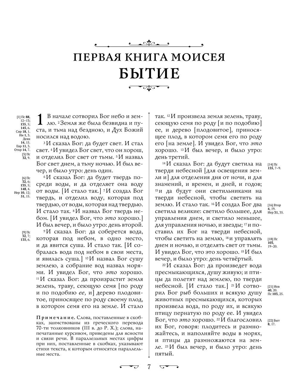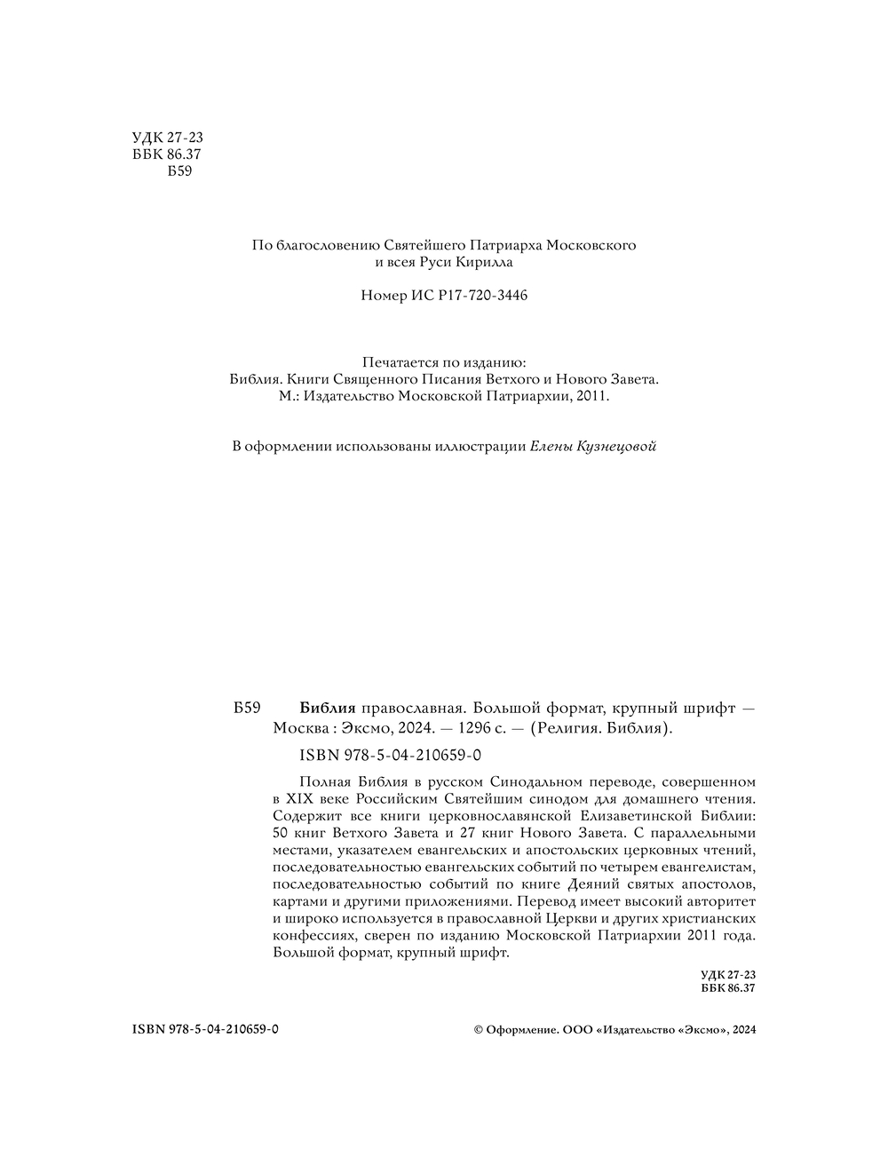 Полная Библия в русском Синодальном переводе, совершенном в XIX веке Российским Святейшим синодом для домашнего чтения. Содержит все книги церковнославянской Елизаветинской Библии: 50 книг Ветхого Завета и 27 книг Нового Завета. С параллельными местами, указателем евангельских и апостольских церковных чтений, последовательностью евангельских событий по четырем евангелистам, последовательностью событий по книге Деяний святых апостолов, картами и другими приложениями.