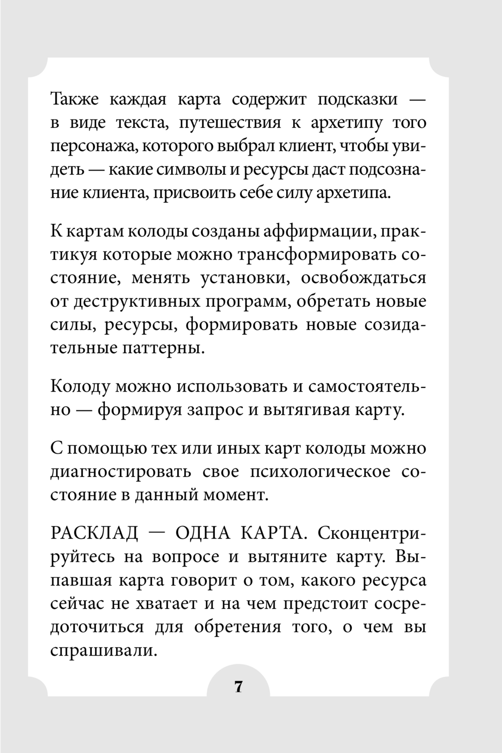 Следуйте за выпавшими вам образами, соединяйте себя с природой тех архетипов, что пришли к вам. Изучайте свои стихии и преобразовывайте их, выходя на совершенно новый уровень жизни! Эти карты идеально подойдут профессиональным психологам и только начинающим постигать искусство МАК.