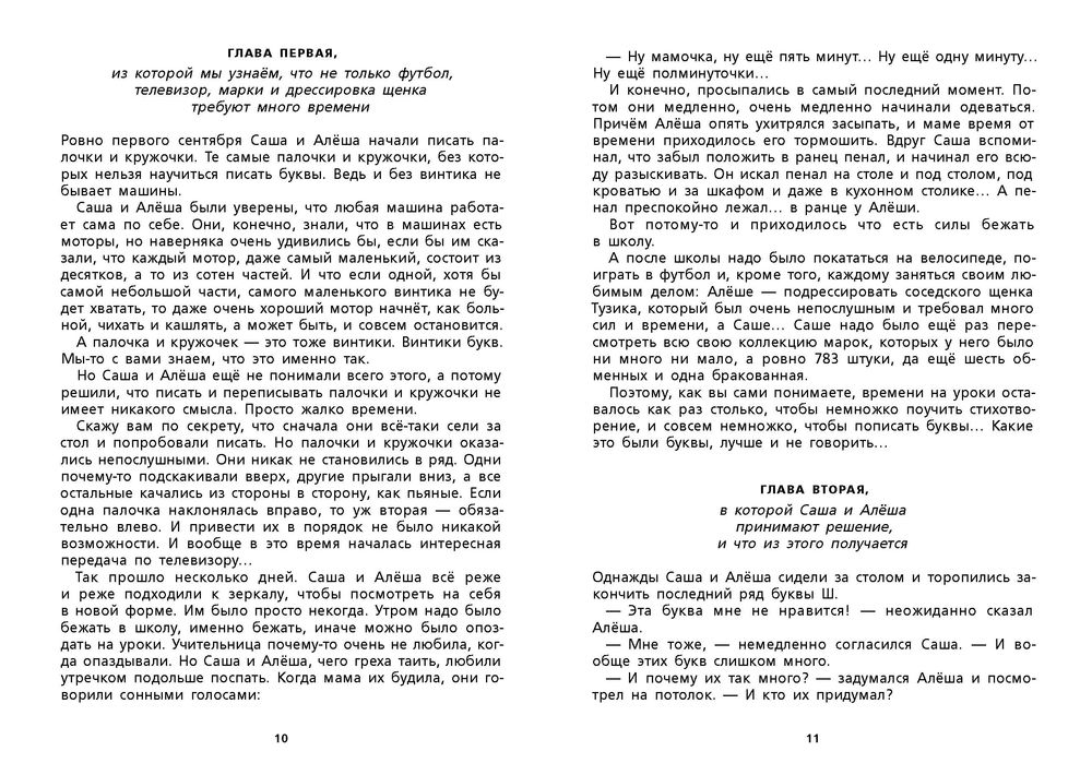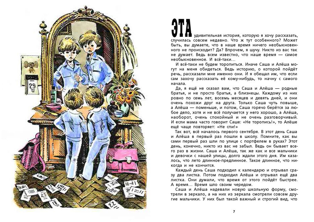 Саша и Алёша – родные братья, и не просто родные братья, а близнецы. Каждому из них ровно по семь лет, восемь месяцев и девять дней, и они очень похожи друг на друга. Всё лето, надев школьную форму, близнецы любовались своим отражением в зеркале и думали о том, что скоро, очень скоро у них начнётся новая жизнь. Но они совсем не догадывались, какие приключения их ожидают.