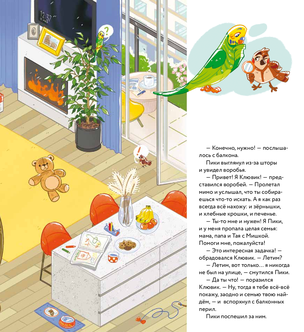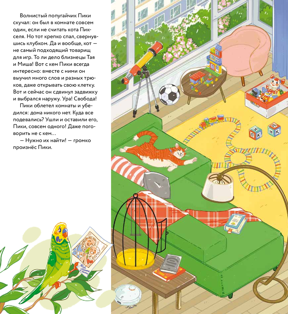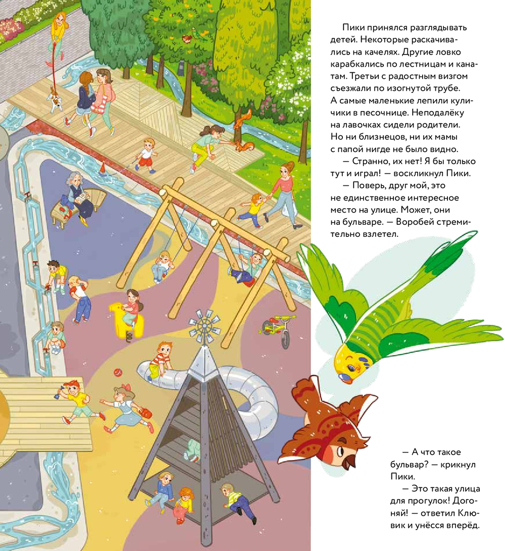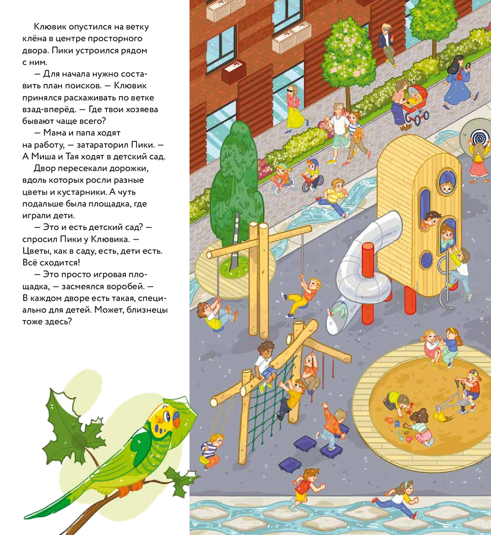 Волнистый попугайчик Пики очень взволнован: его любимые хозяева ушли и оставили его дома совсем одного. Куда же они отправились из их уютной квартиры так надолго? Смелый и любознательный Пики решает лететь на поиски. А поможет ему новый друг – воробей Клювик, настоящий пернатый детектив и специалист по множеству вопросов. Вместе с главными героями читатели побывают на детской и спортивной площадках, пешеходном бульваре, в детском саду и других местах, а заодно узнают, что делает дворы такими комфортными и интересными.