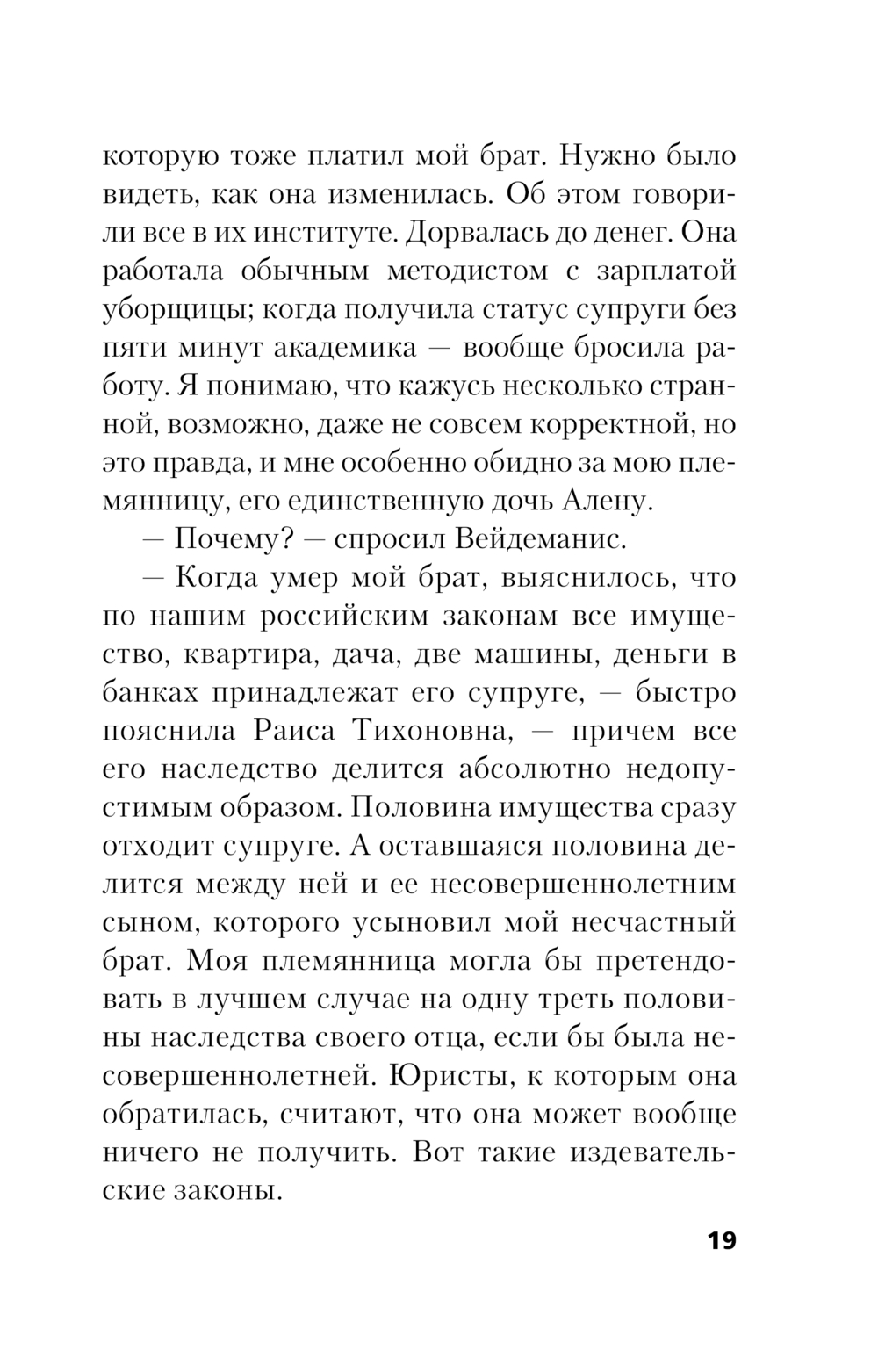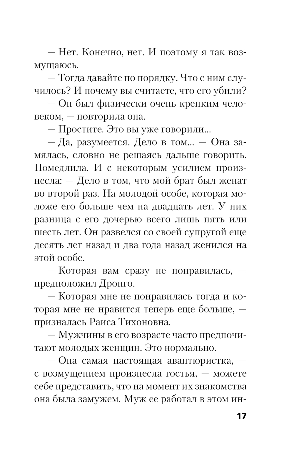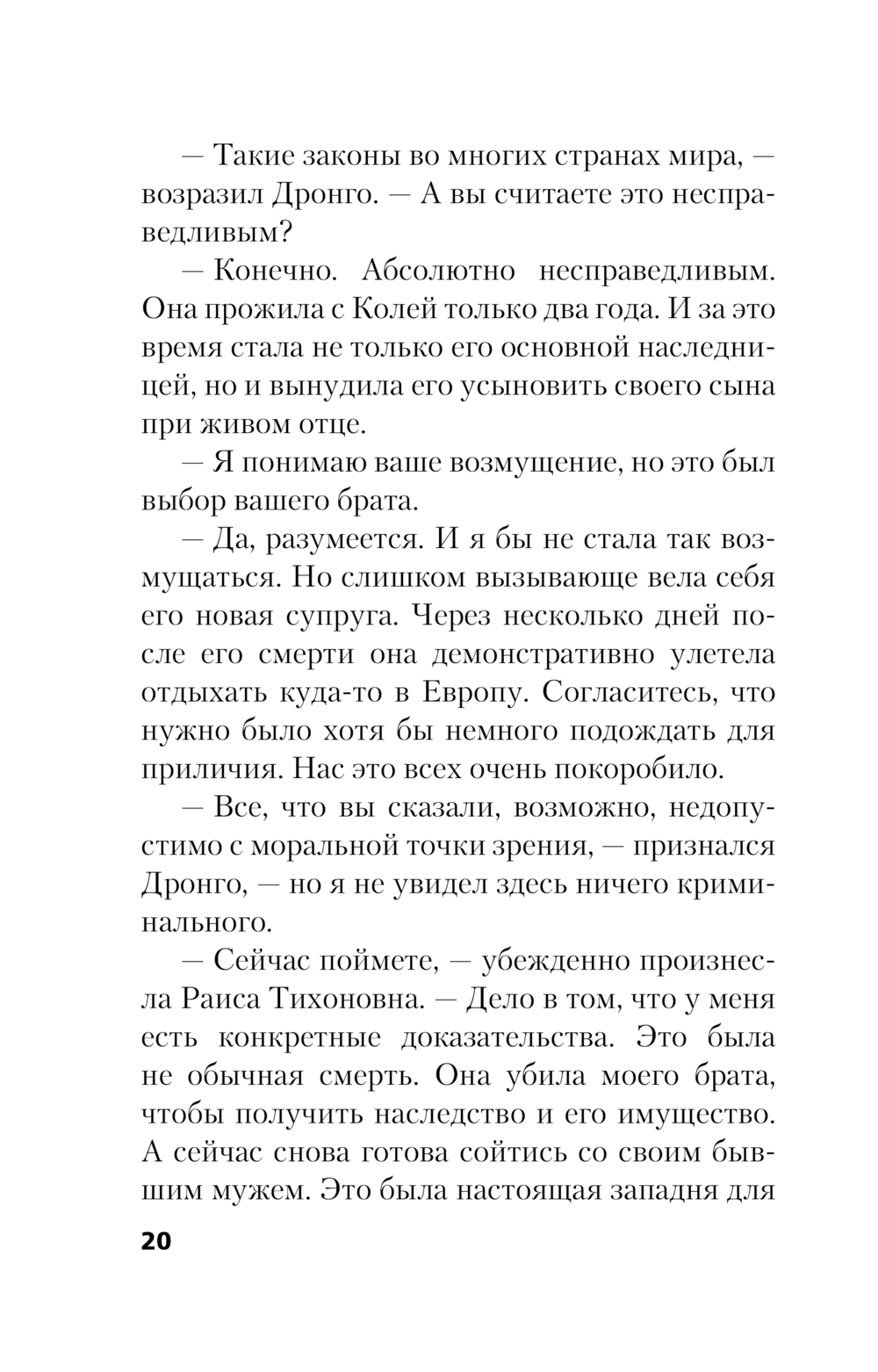 В Москве в расцвете сил умирает академик Николай Долгоносов, директор одного из крупнейших научно-исследовательских институтов. Врачи констатируют обширный инфаркт, но сестра покойного Раиса не верит заключению врачей. Она считает, что брата убили из-за наследства, и убийца – Далвида, молодая жена академика. Раиса обращается за помощью к известному частному сыщику Дронго. Тот берется за расследование, понимая, что врачи, скорее всего, правы, и смерть академика никаким образом не связана с криминалом. Но вскоре его отношение к делу меняется: при загадочных обстоятельствах погибает близкий знакомый Долгоносова, и профессиональное чутье подсказывает Дронго, что это не простое совпадение...