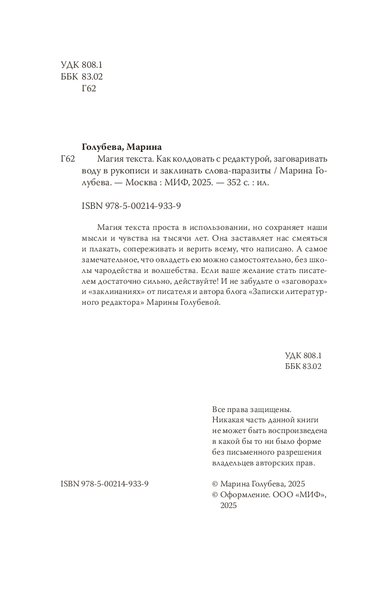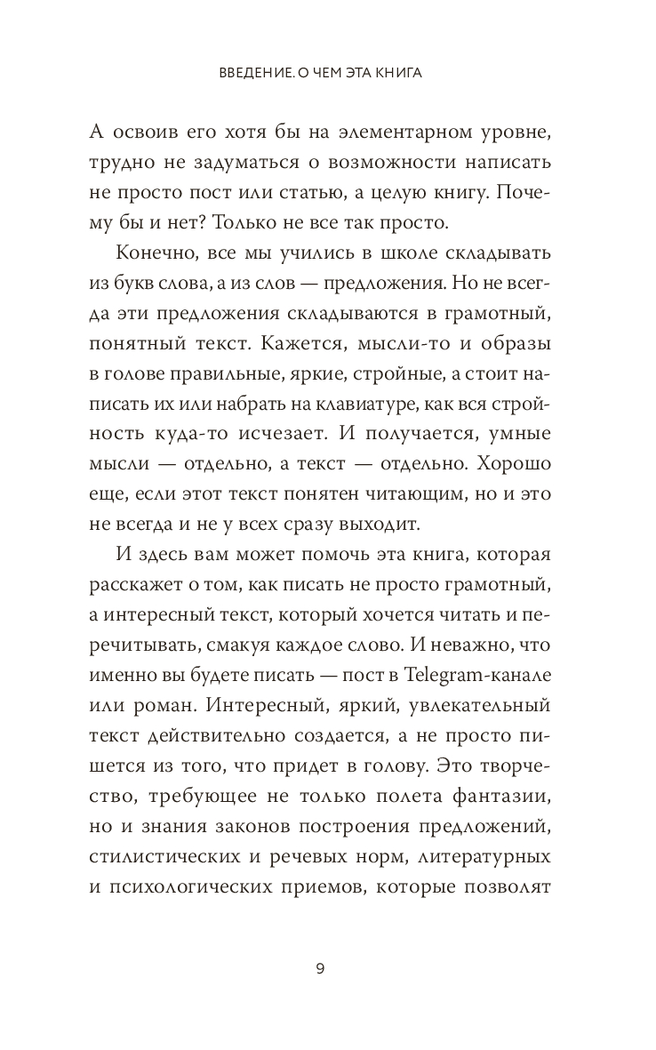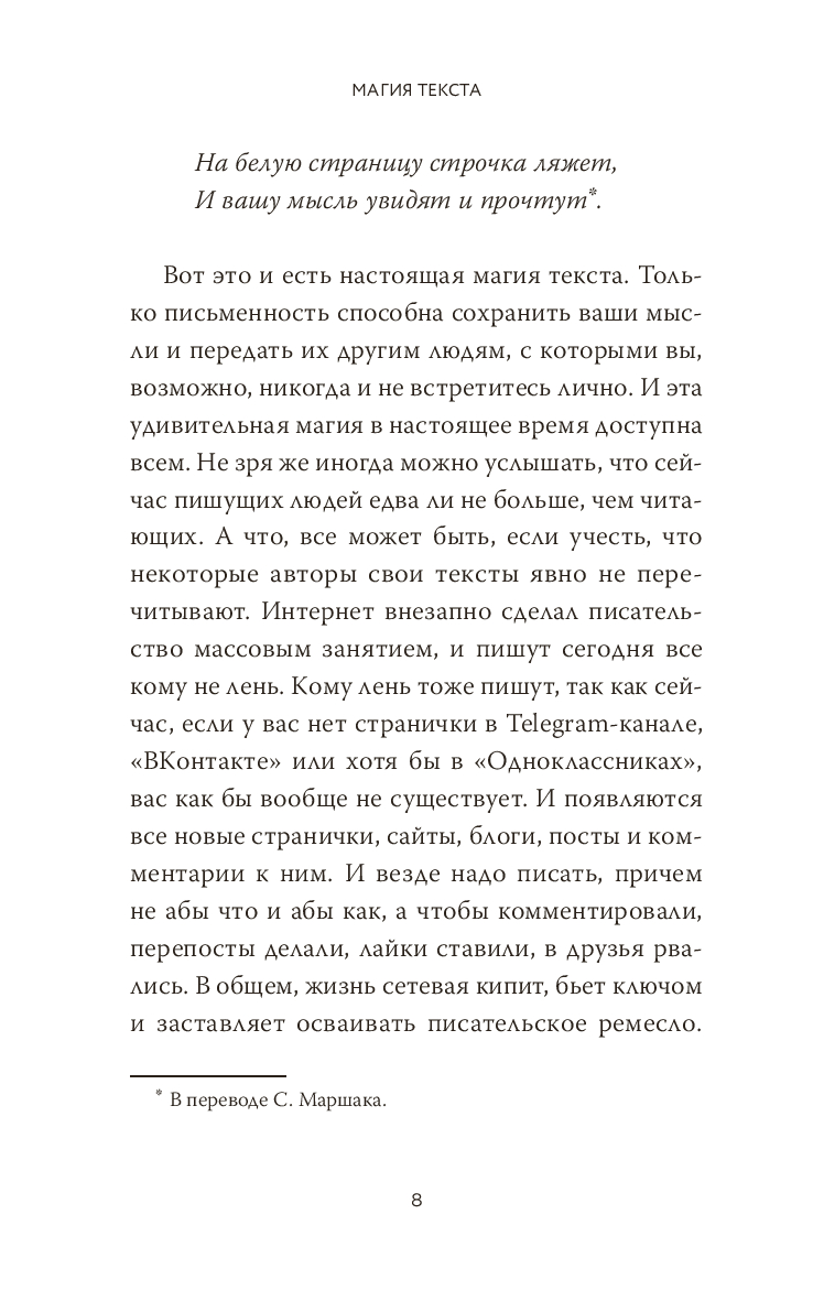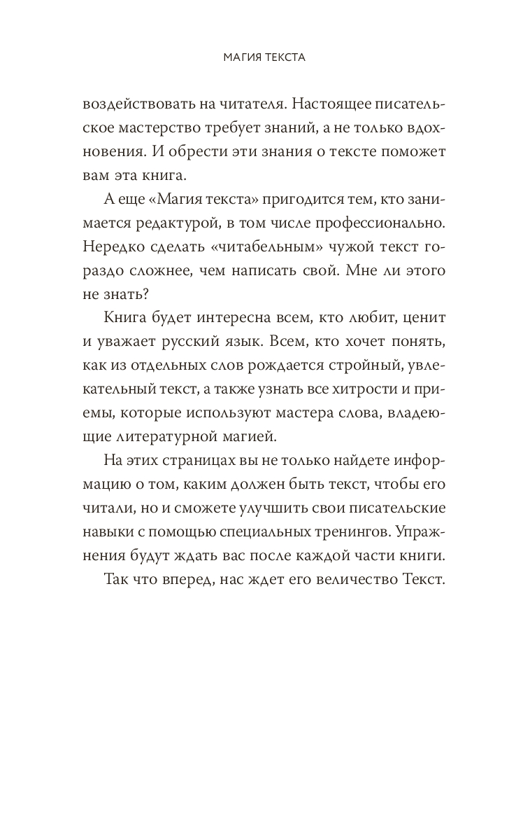 Автор расскажет о том, как писать не просто грамотный, но и интересный текст, который хочется читать и перечитывать, смакуя каждое слово. И неважно, что вы будете писать – пост в соцсети, отзыв на книгу или собственный роман. Интересный и яркий текст действительно создается, а не просто пишется, как придет в голову. Настоящее писательское мастерство требует не только полета фантазии, но и знания законов построения предложений, стилистических и речевых норм, литературных и психологических приемов. Обрести такие знания о магии текста поможет вам эта книга.