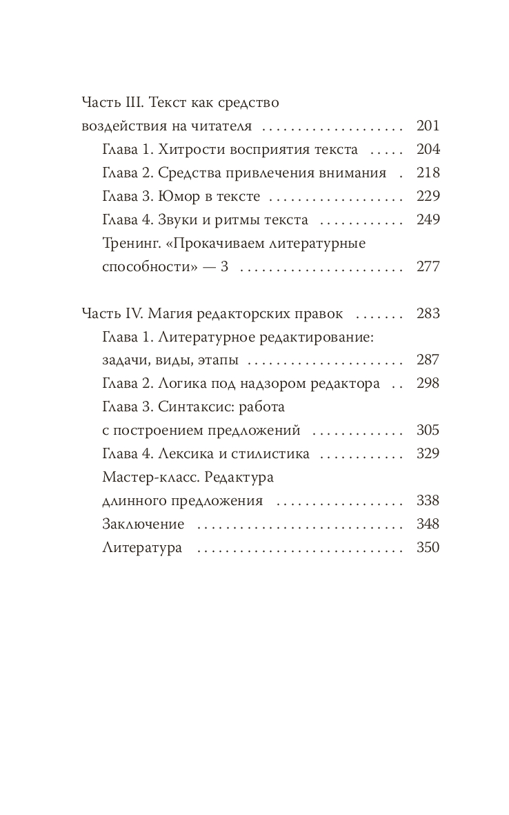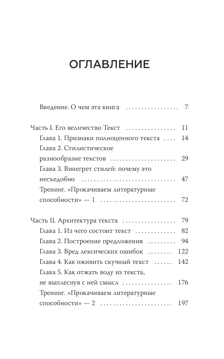 Эта книга состоит из 4 частей. Первая рассказывает о внешней форме текста и стилях, вторая – о содержательной части текста, третья учит, как при помощи слов и фраз воздействовать на читателя, а четвертая посвящена литературному редактированию и приемам улучшения текста.