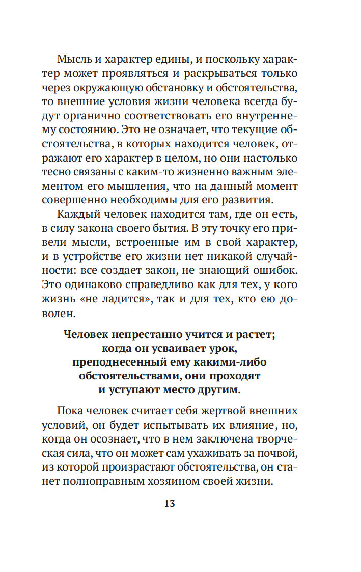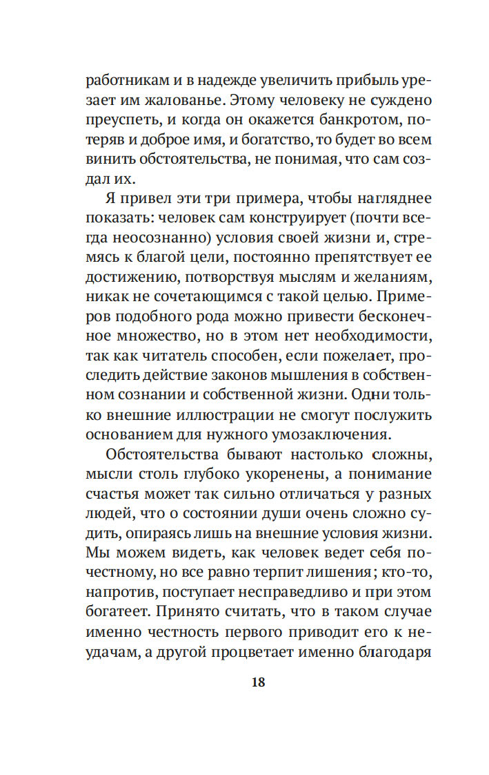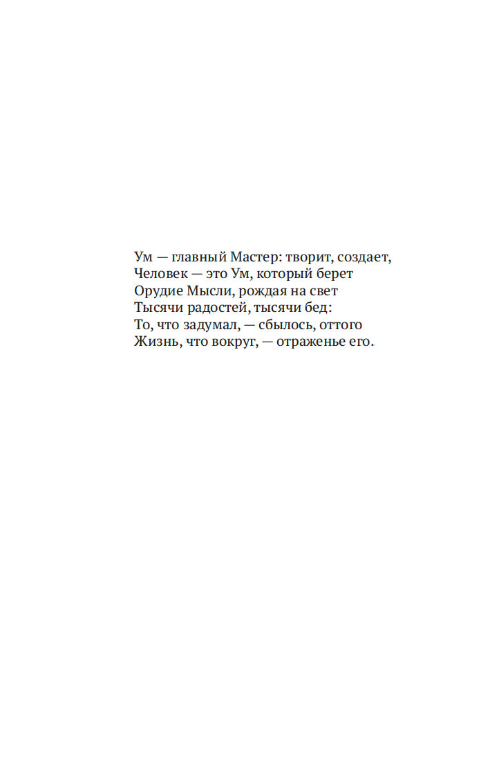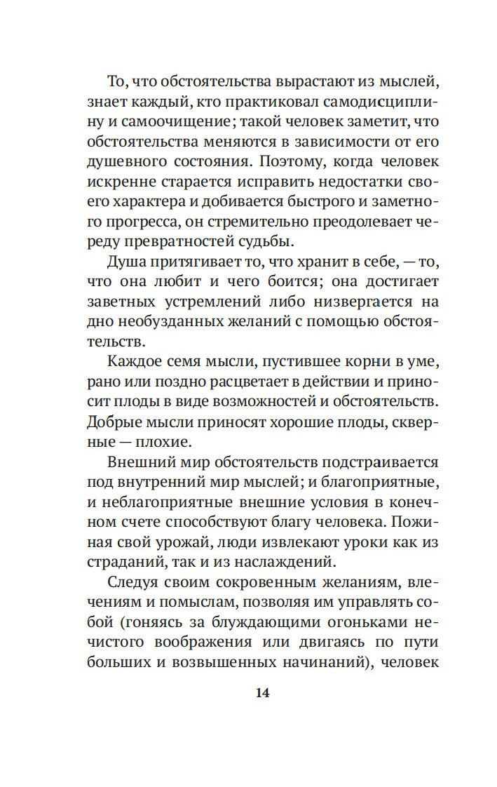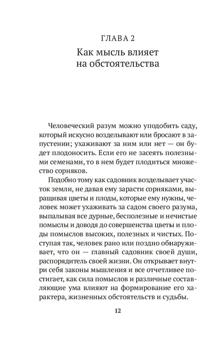 Джеймс Аллен (1864–1912) – известный британский философ и поэт, один из зачинателей жанра "мотивационной литературы". Его работа "Как мыслит человек", опубликованная в 1903 году, до сих пор остается одним из самых цитируемых текстов в мире и привлекает внимание всех любителей книг по саморазвитию. Как управлять своей жизнью? Как достичь процветания и завоевать симпатию и доверие окружающих? Как избежать страданий и неудач? На эти и другие вопросы Джеймс Аллен дает вполне определенные, очень практичные ответы, нисколько не устаревшие за прошедший век.