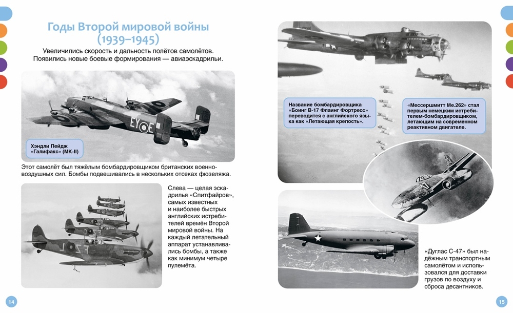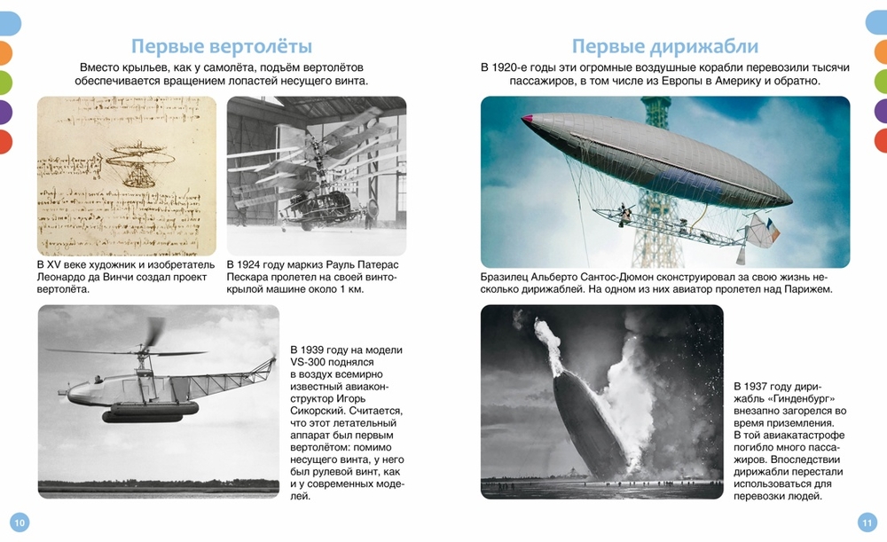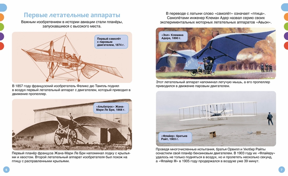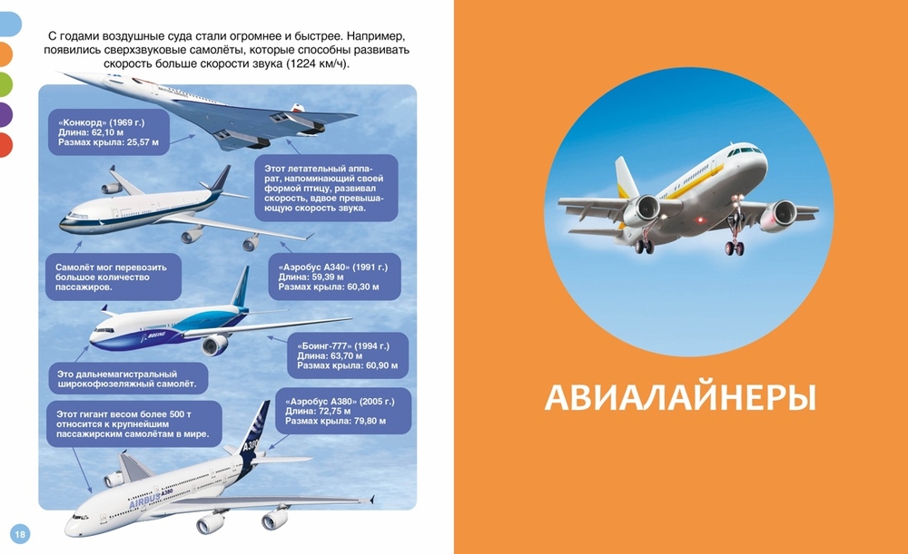 В этой книге рассказывается об истории авиации. Юные читатели узнают, чем прославились братья Орвилл и Уилбер Райт, какой размах крыла был у "Боинга-707", для чего используются аэродинамические тормоза, рассмотрят дирижабли, истребители, пассажирские самолёты, а также выяснят, что такое несущий винт и кто сконструировал первый воздушный шар.