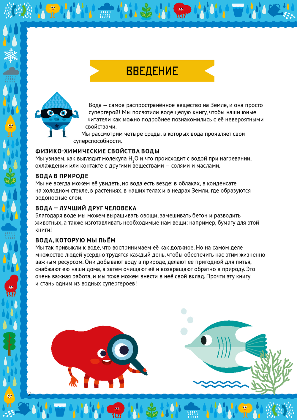 В этой интерактивной энциклопедии мы рассмотрим воду с точки зрения физики и химии, узнаем, что собой представляет вода в природе, что и кто делает воду пригодной для питья, как вода помогает нам строить дома и почему без воды не было бы даже... этой книги!