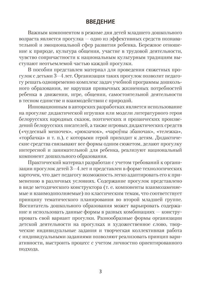 В пособии представлен материал для проведения сюжетных прогулок с детьми от 3 до 4 лет: содержание педагогической работы, формы организации, методы и приемы реализации задач. Технологические карточки разработаны с учетом достижений современной дошкольной педагогики и тематического планирования образовательного процесса, направлены на разностороннее развитие ребенка, комплексное решение задач обучения и воспитания, реализацию национального компонента дошкольного образования.
