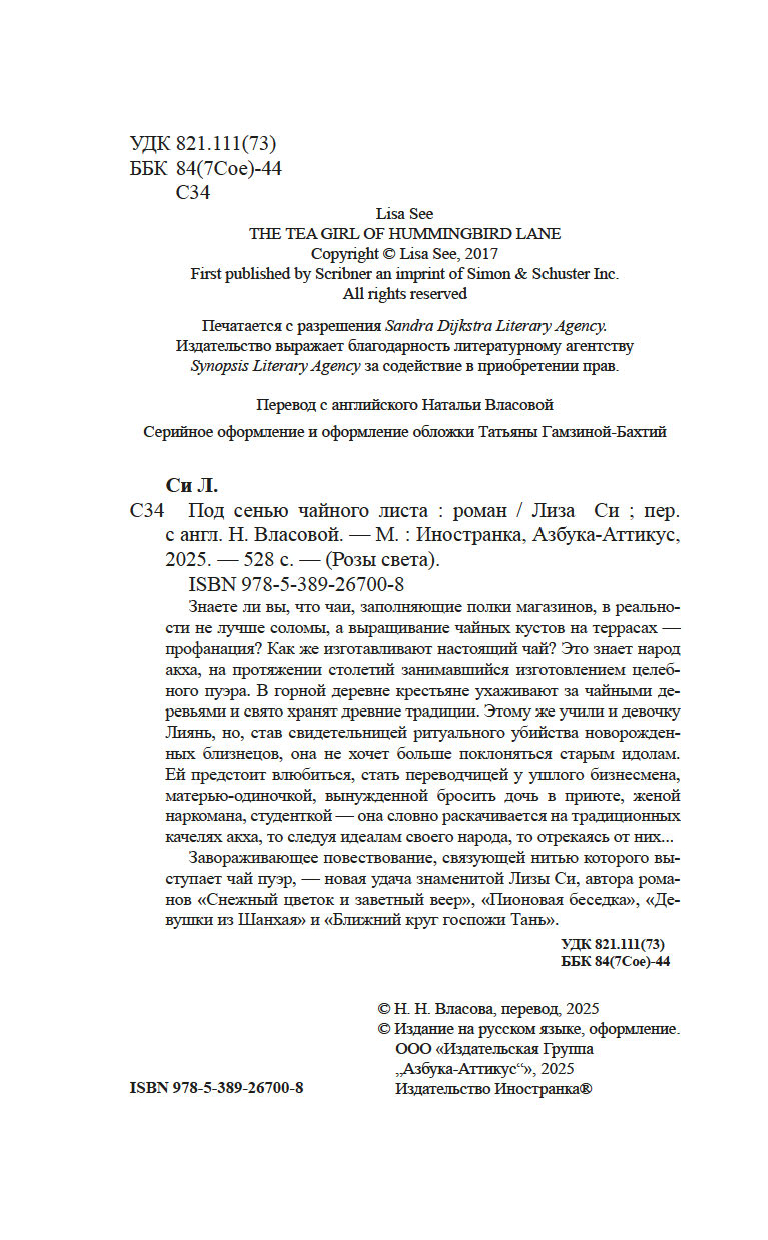 Завораживающее повествование, связующей нитью которого выступает чай пуэр, – новая удача знаменитой Лизы Си, автора романов "Снежный цветок и заветный веер", "Пионовая беседка", "Девушки из Шанхая" и "Ближний круг госпожи Тань".