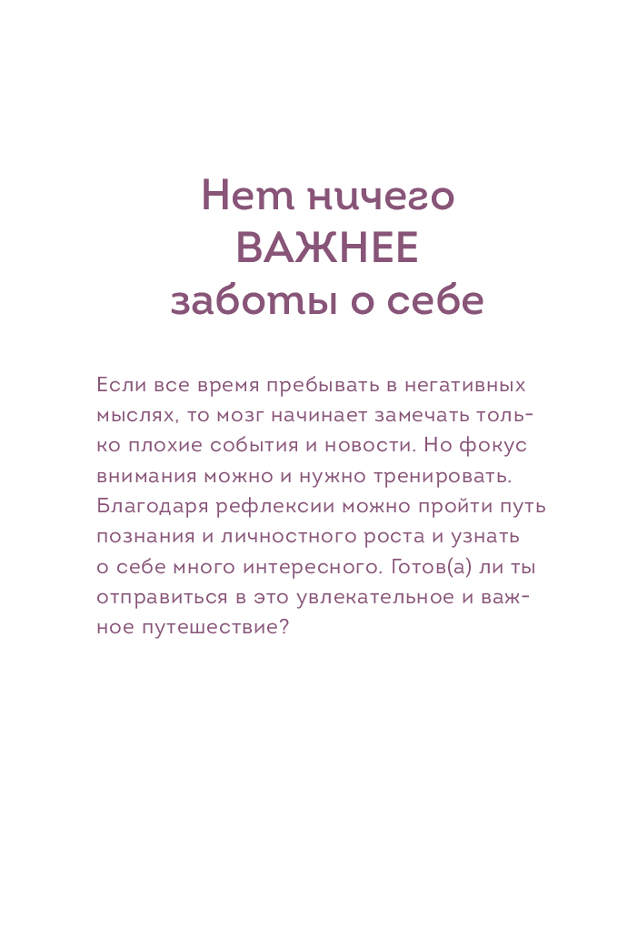 Главное – начать! Этот блокнот создан для того, чтобы помочь познакомиться с самим собой. Позволь себе отвлечься от суеты повседневности и окунуться в свой внутренний мир.
