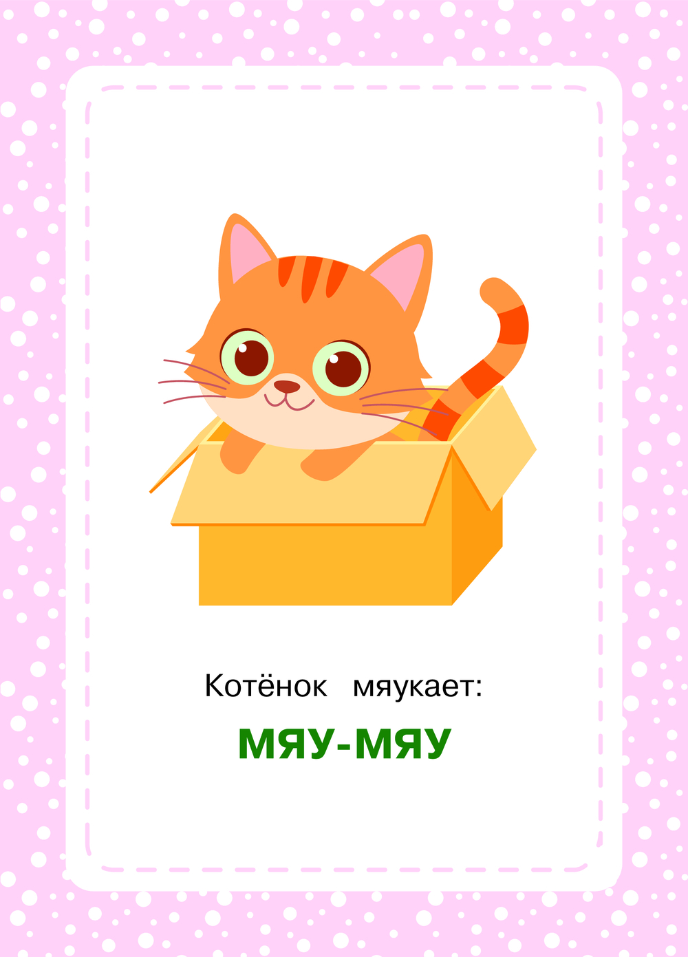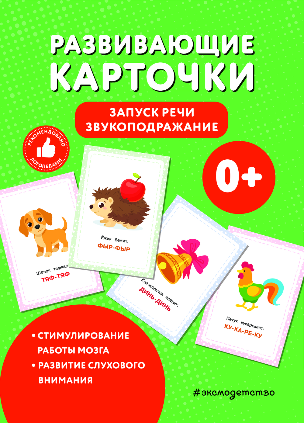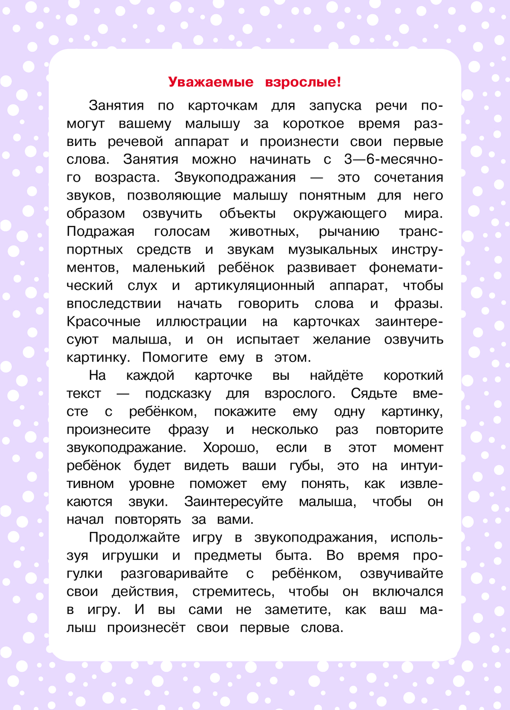 Развивающие карточки предназначены запуска речи малышей, начиная с 6-месячного возраста. В комплекте 34 плотные двусторонние карточки с имитацией звуков животных, транспорта, музыкальных инструментов, людей и природных явлений.