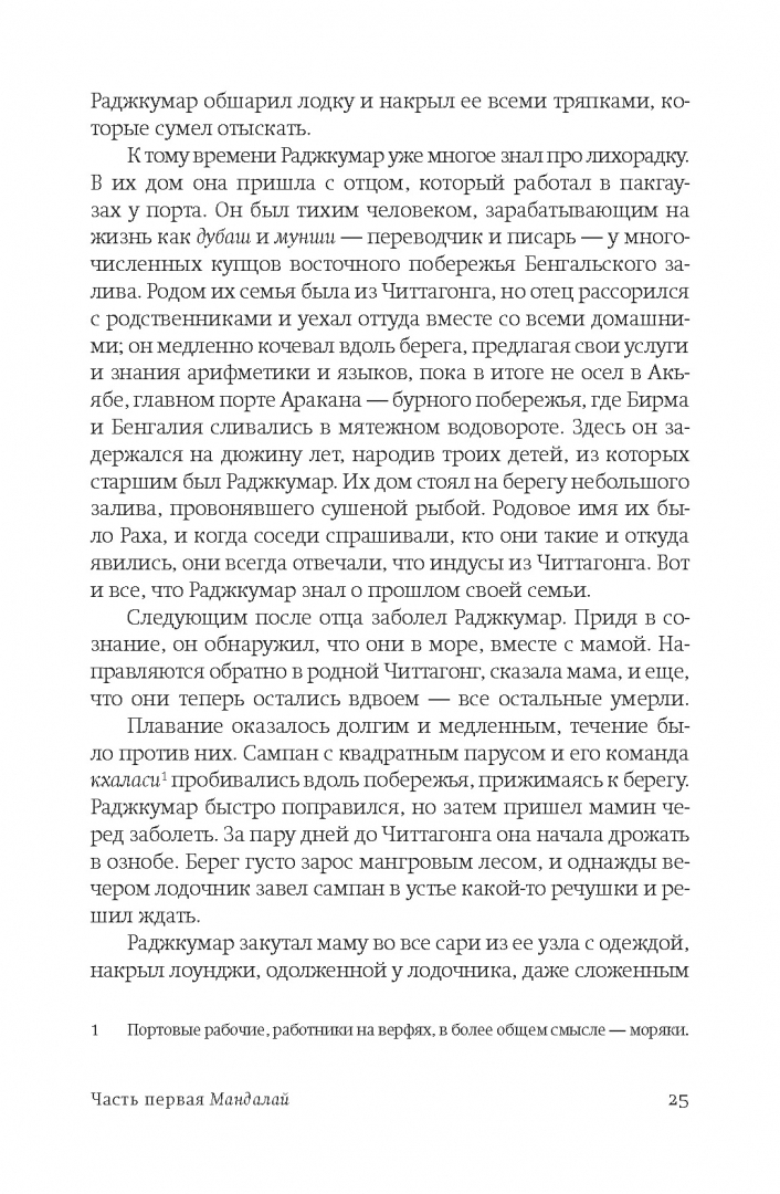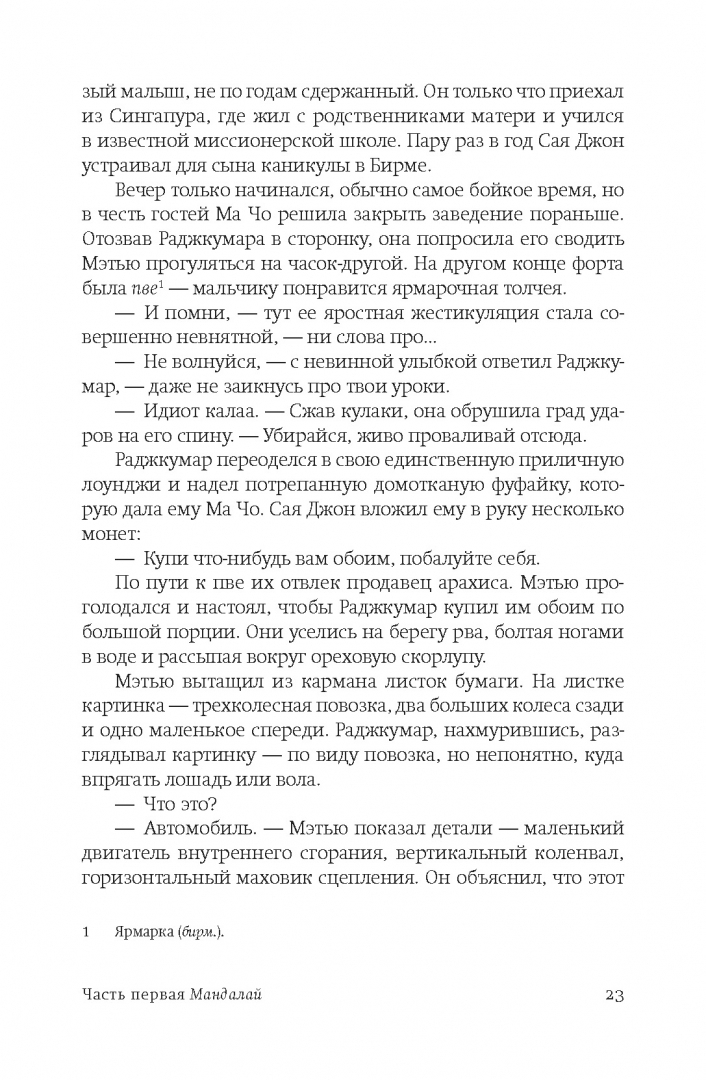 Так начнется сложная, многоплановая история Раджкумара и Долли, в орбиту которой будут попадать все новые и новые герои. Их судьбы окажутся напрямую связаны с судьбой Индии, Бирмы и Малайи. Бедные и богатые, короли и безродные сироты, плантаторы и революционеры, военные и студенты – кого только нет в этом динамичном, насыщенном событиями, исторически точном романе. И каждая судьба, каждая история тесно связана с другими судьбами и историями, и вместе они образуют невероятное, очень красочное, полное мельчайших ярких деталей полотно.
