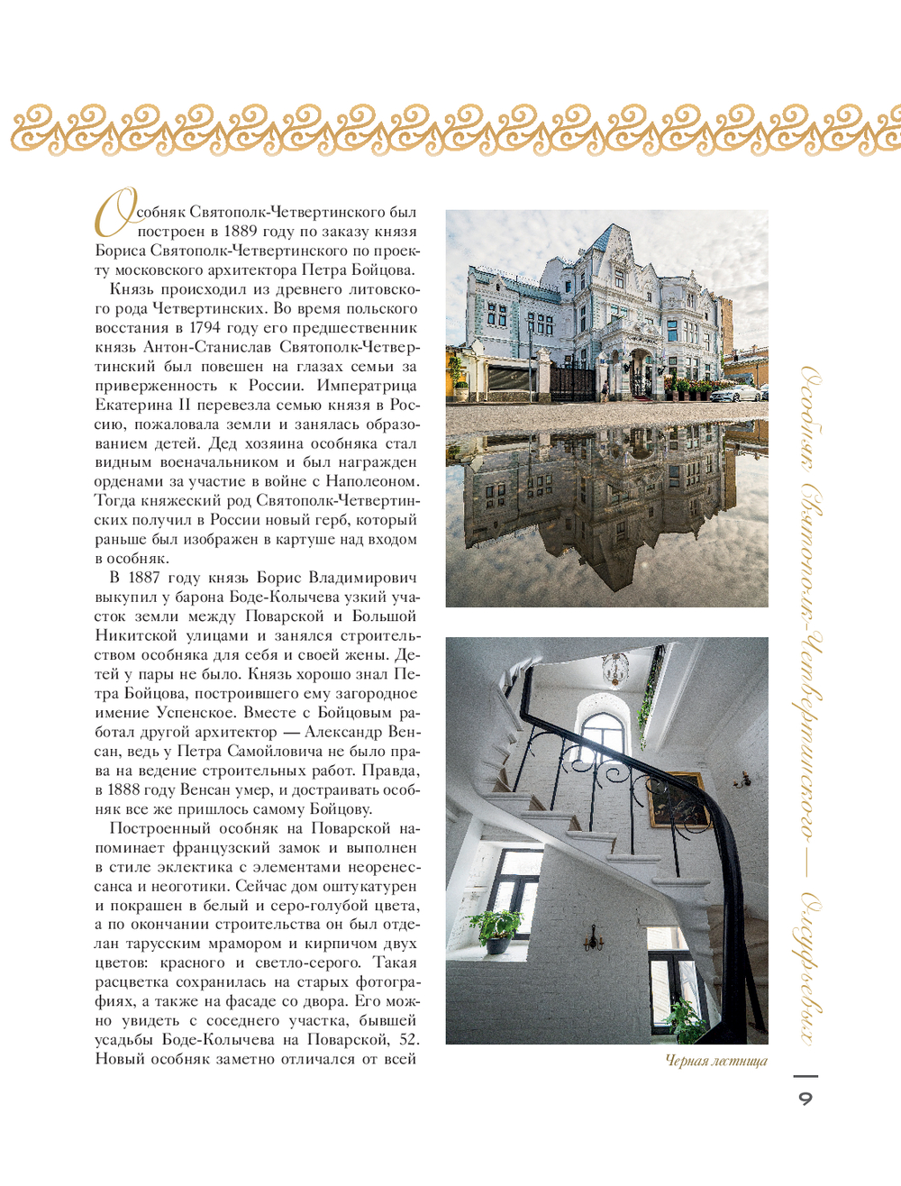 В книгу включены дома, построенные или перестроенные в промежутке с 1870‑х до 1910‑х годов – всего 61 особняк и более 900 фотографий! Да, это настоящий фотоальбом с захватывающими панорамами и вниманием к деталям. Великолепный подарок для всех ценителей архитектуры и истории.