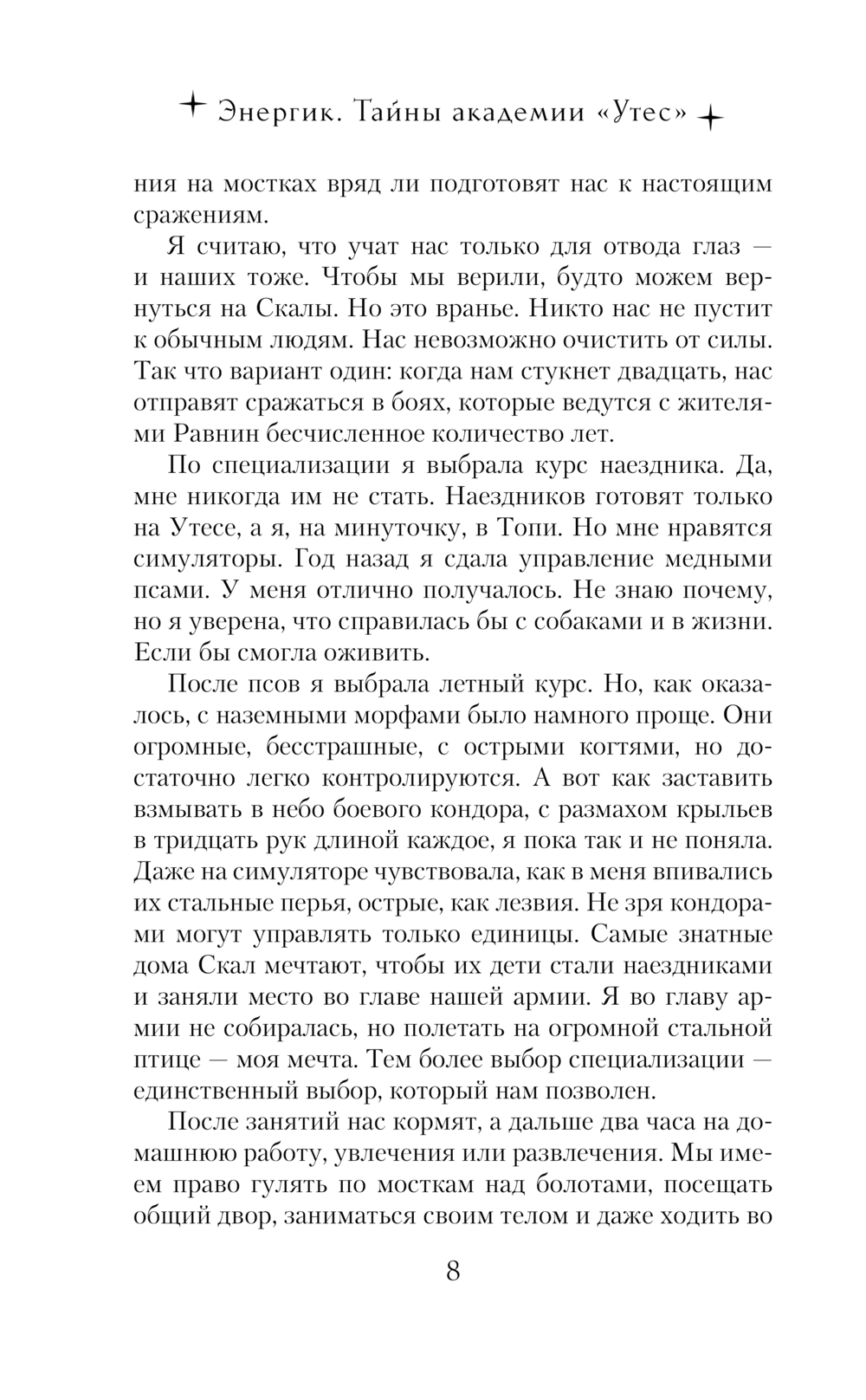 Дана должна попасть в элитную Академию "Утес", где училась сестра. Именно здесь готовят наездников стальных кондоров и именно здесь начали загадочно исчезать энергики. Помочь Дане могут только Морсы, близнецы-внушители. Если план вскроется – Дану ждет смерть. Но терять ей нечего.
